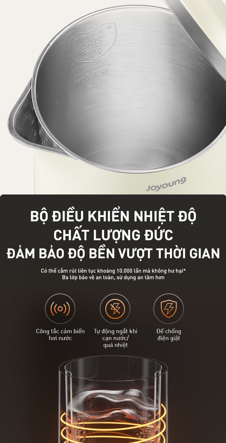 - Bộ điều khiển nhiệt độ chất lượng Đức: Bền bỉ vượt thời gian, Có thể cắm rút liên tục khoảng 10.000 lần mà không hư hại* (Dựa trên dữ liệu phòng thí nghiệm nội bộ của Joyoung).