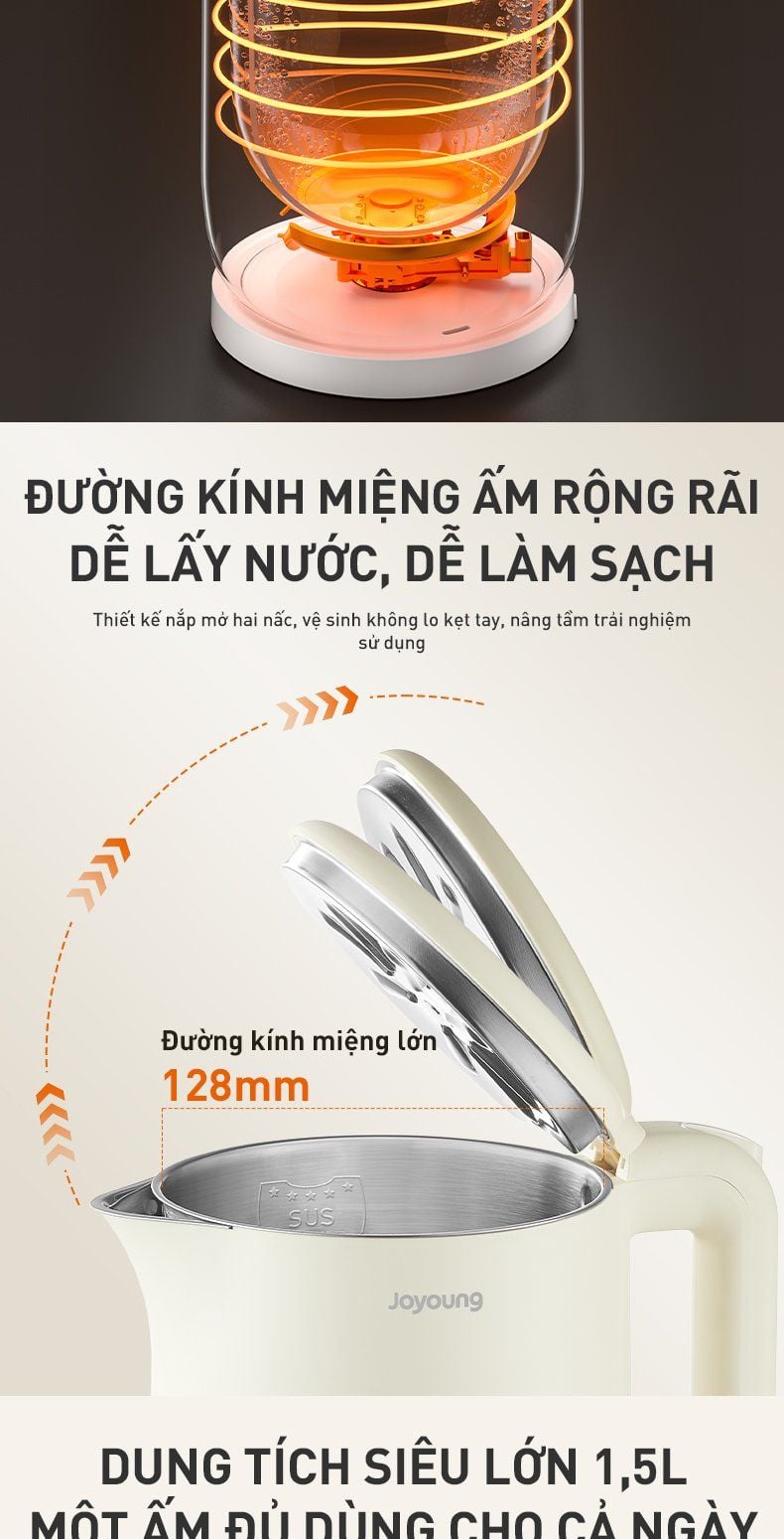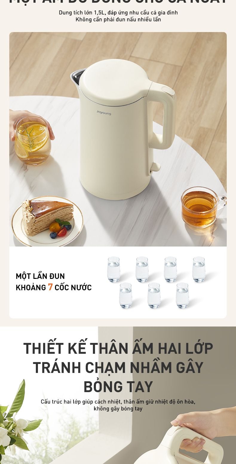 - Dung tích siêu lớn 1,5L: Một ấm đủ dùng cho cả ngày, không cần đun nấu nhiều lần, mỗi lần đun được khoảng 7 cốc nước.