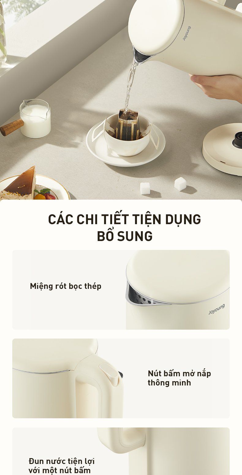 - Các chi tiết tiện dụng bổ sung: Miệng rót bọc thép, nút bấm mở nắp thông minh, đun nước tiện lợi với một nút bấm.