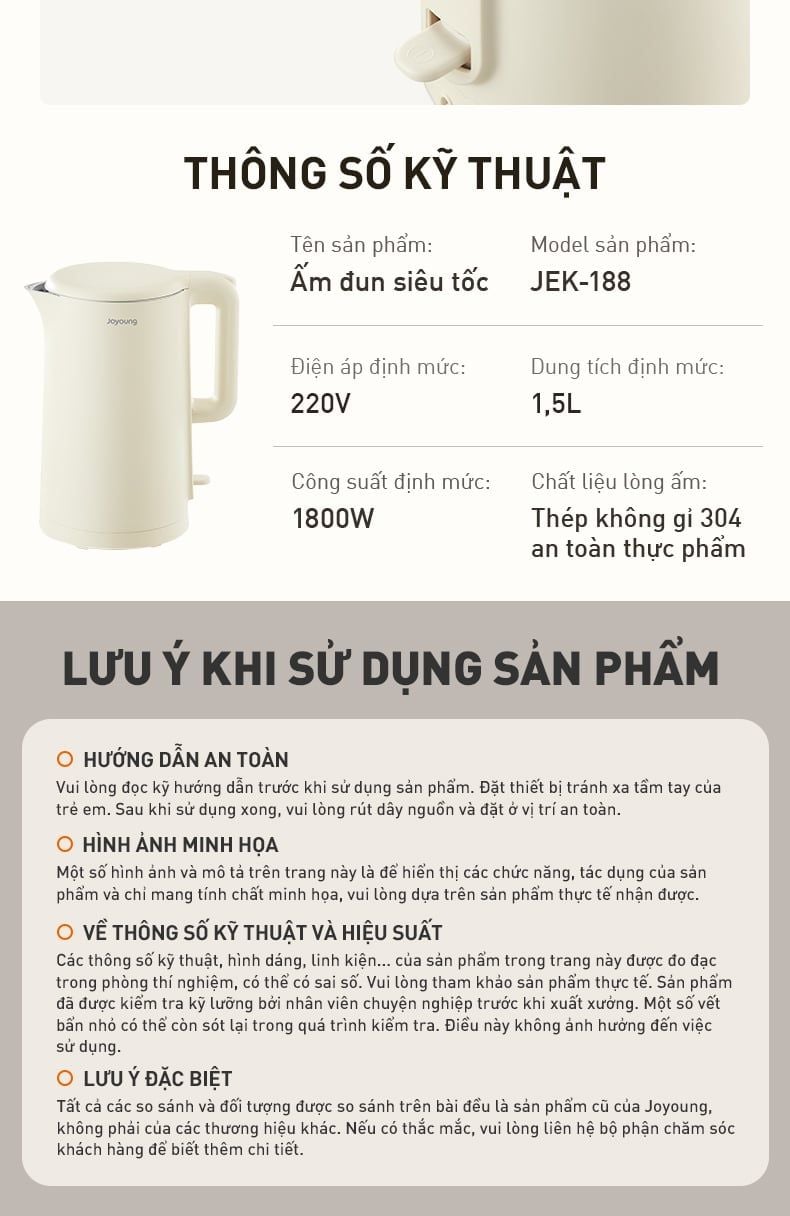 Ấm đun siêu tốc JEK-188 giúp bạn tiết kiệm thời gian hiệu quả khi pha trà, cà phê hay chỉ đơn giản là đun nước uống. Đồng thời, công nghệ giảm ồn giúp ấm vận hành êm ái, không gây tiếng ồn lớn ảnh hưởng đến không gian sinh hoạt.