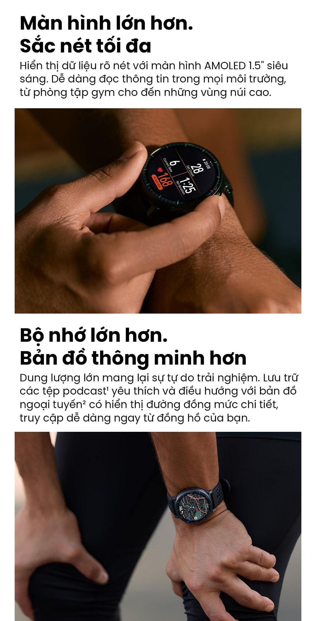 - Hiển thị dữ liệu rõ nét với màn hình AMOLED 1.5" siêu sáng. Dễ dàng đọc thông tin trong mọi môi trường, từ phòng tập gym cho đến những vùng núi cao.