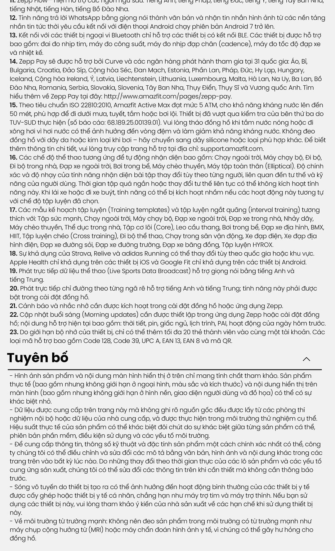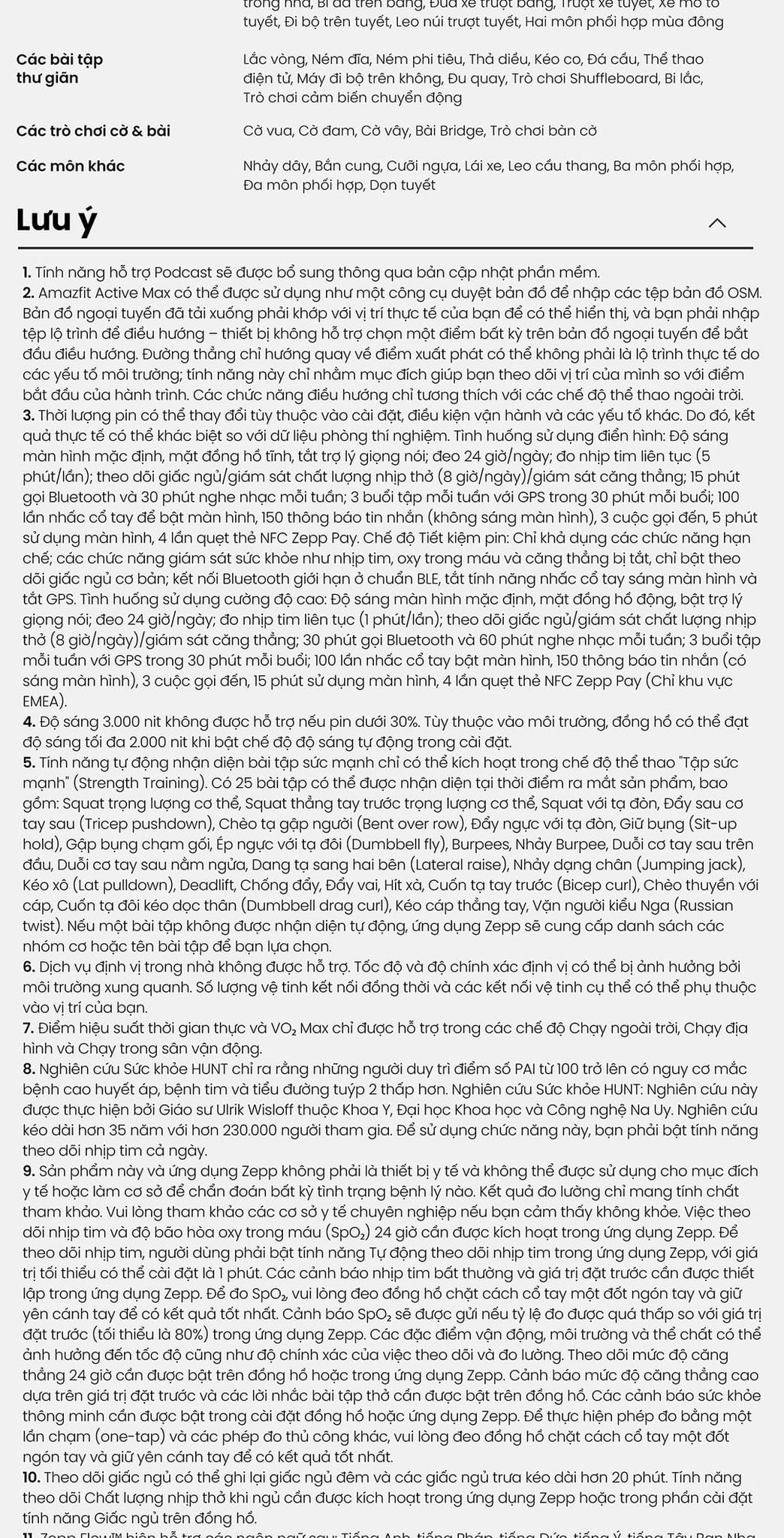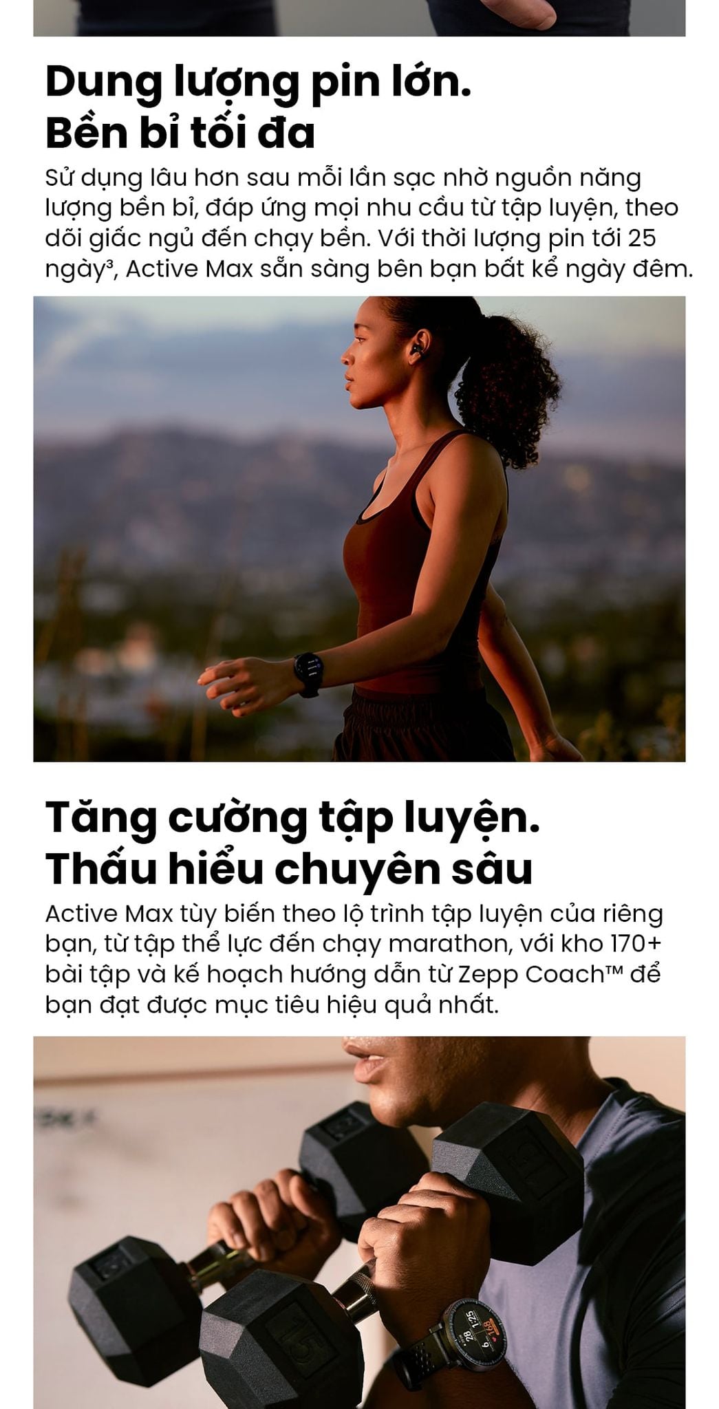 - Active Max tùy biến theo lộ trình tập luyện của riêng bạn, từ tập thể lực đến chạy marathon, với kho 170+ bài tập và kế hoạch hướng dẫn từ Zepp Coach™ để bạn đạt được mục tiêu hiệu quả nhất.