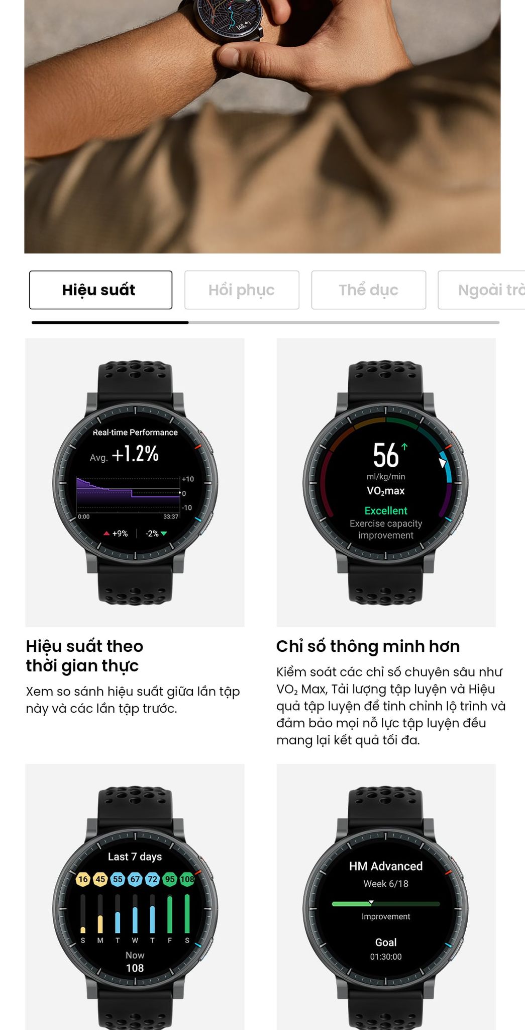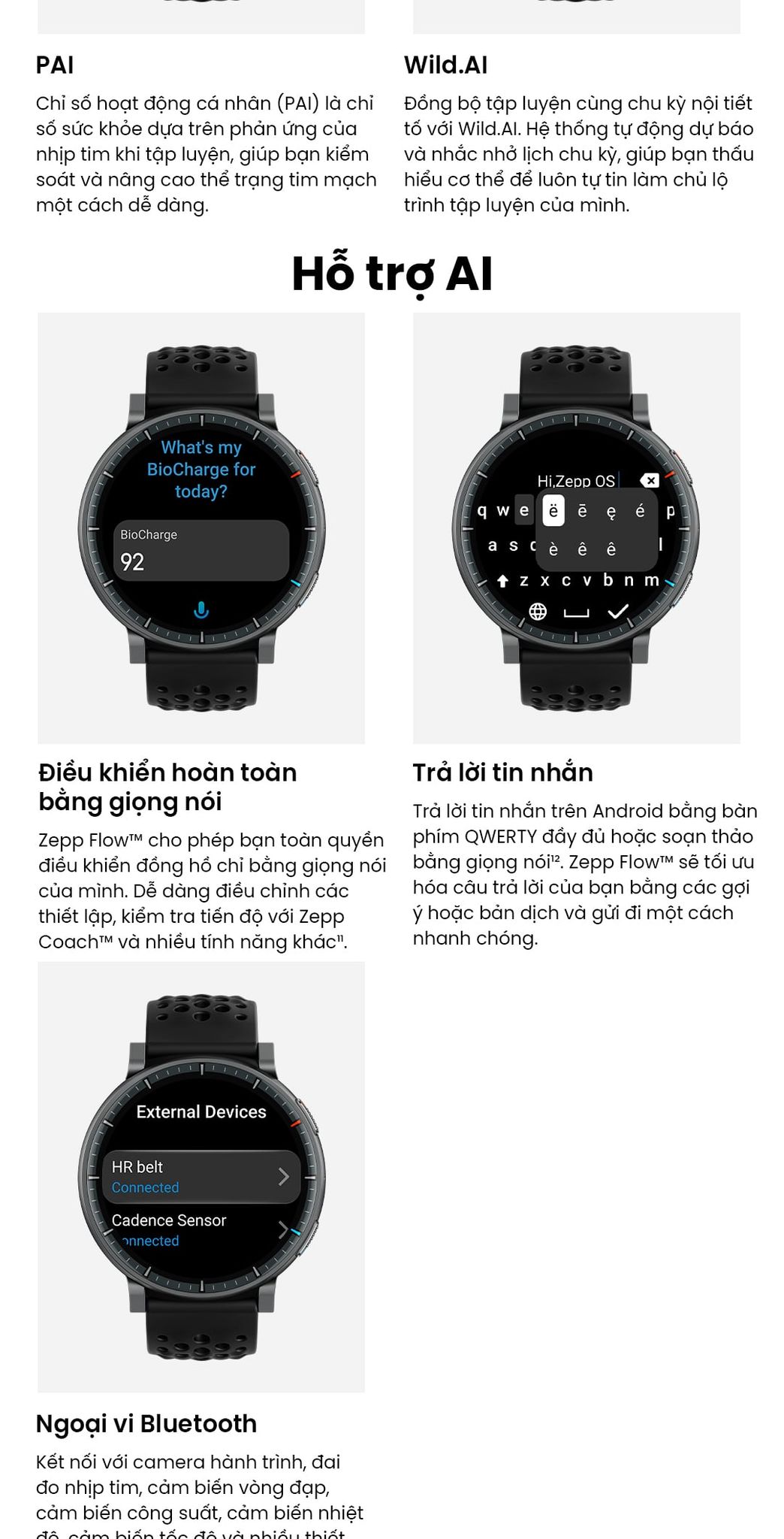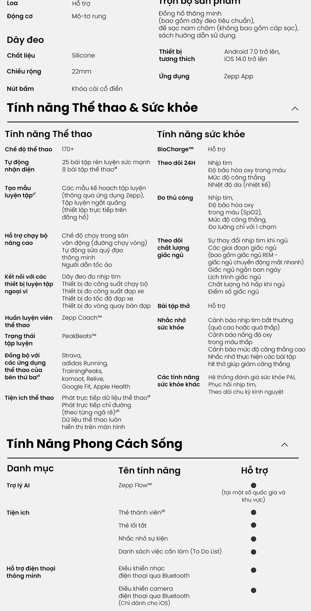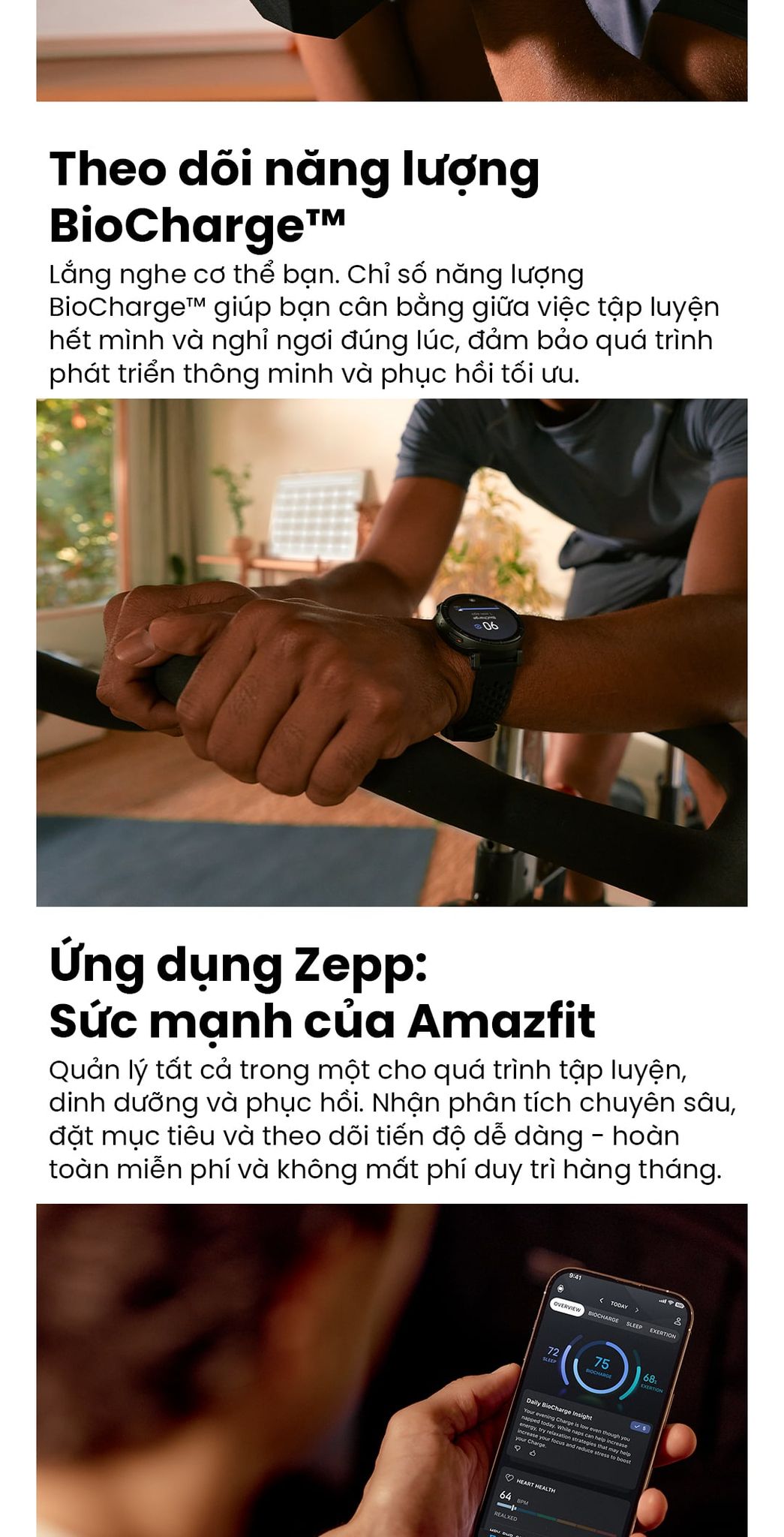 - Tính năng theo dõi năng lượng BioCharge™ và kế hoạch tập luyện thích ứng Zepp Coach™, thiết bị mang đến sức bền, sự thấu hiểu và động lực giúp bạn bứt phá trên mọi chặng đường.