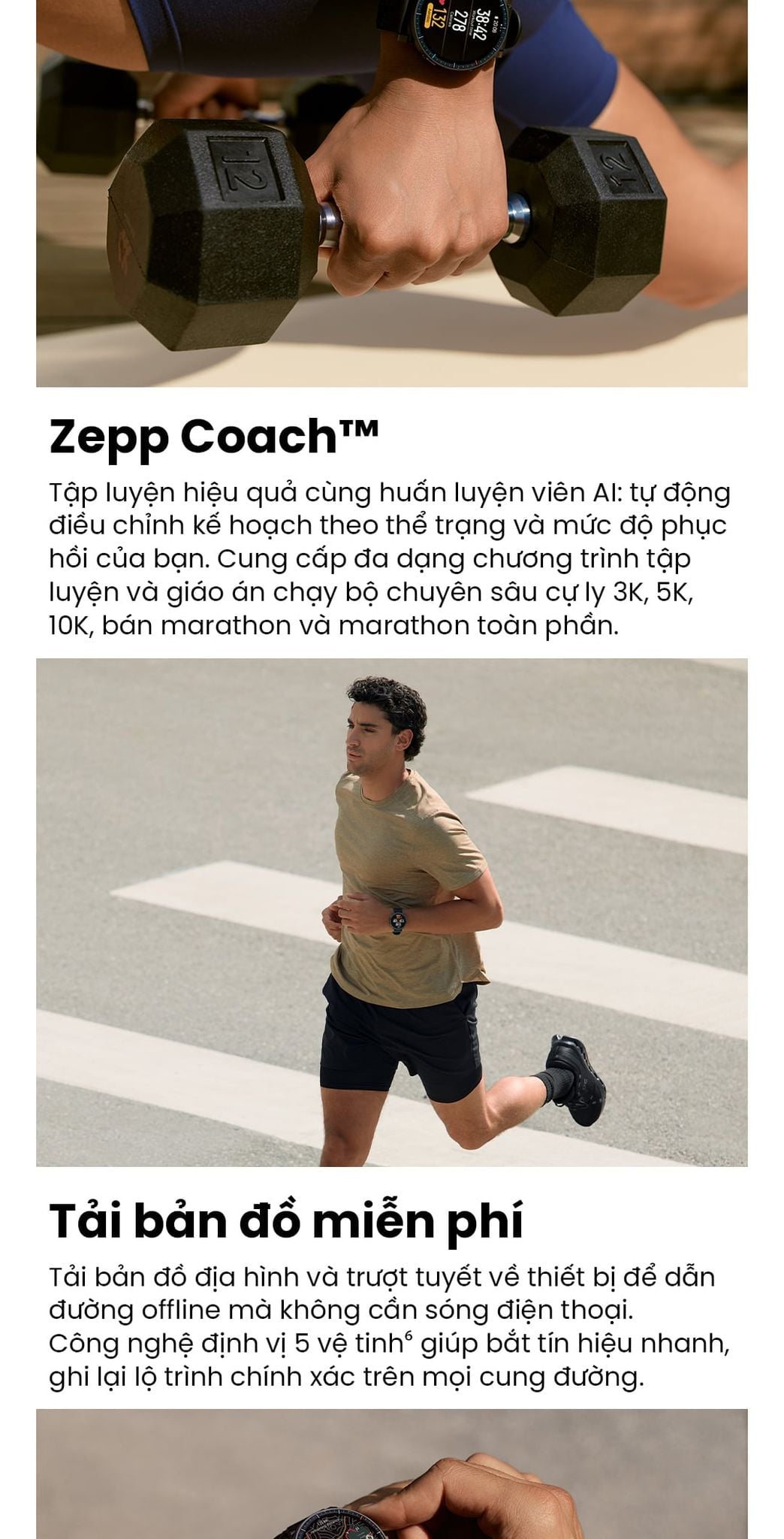 - Zepp Coach™ - Tập luyện hiệu quả cùng huấn luyện viên AI: tự động điều chỉnh kế hoạch theo thể trạng và mức độ phục hồi của bạn. Cung cấp đa dạng chương trình tập luyện và giáo án chạy bộ chuyên sâu cự ly 3K, 5K, 10K, bán marathon và marathon toàn phần.