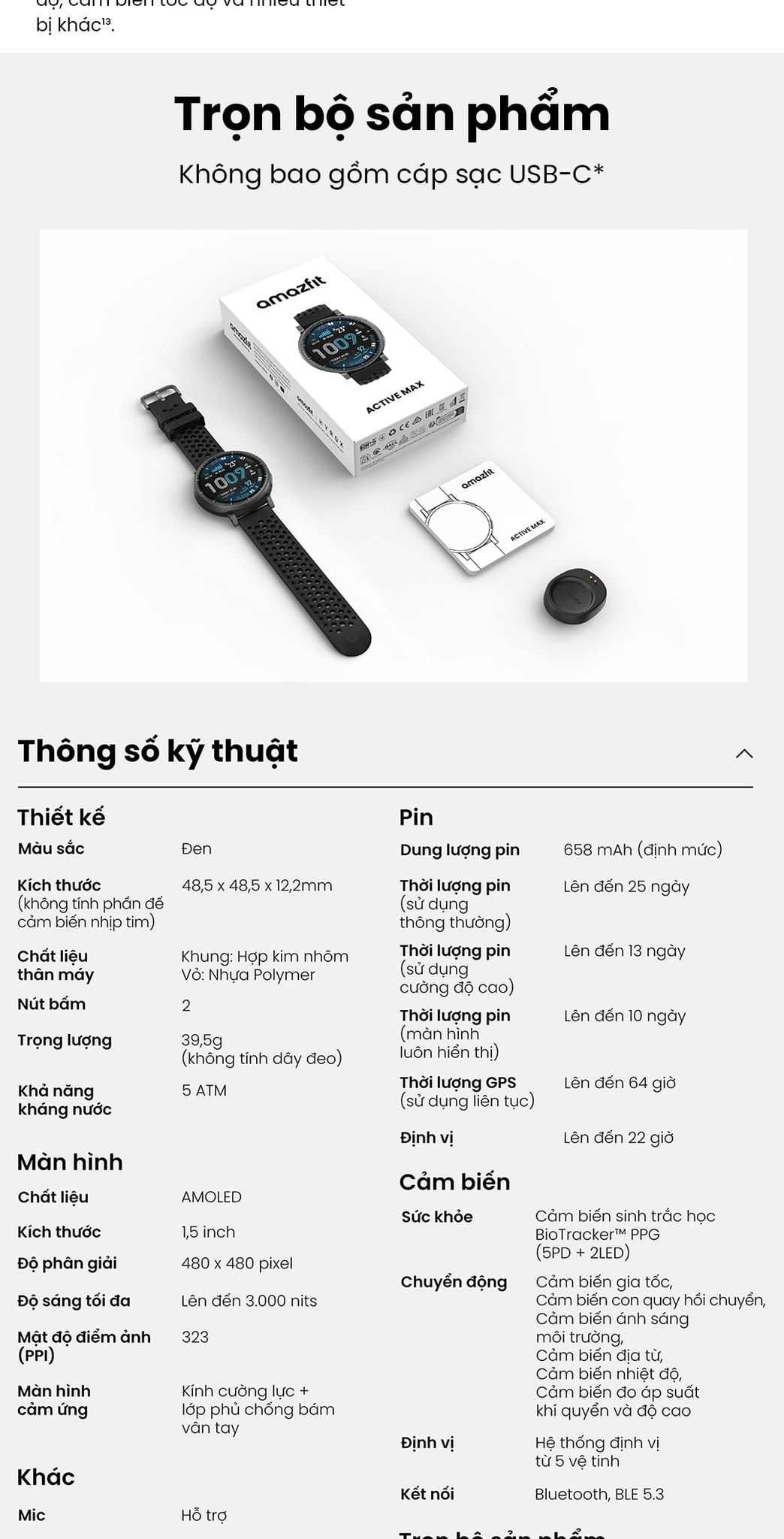 - Sử dụng lâu hơn sau mỗi lần sạc nhờ nguồn năng lượng bền bỉ, đáp ứng mọi nhu cầu từ tập luyện, theo dõi giấc ngủ đến chạy bền. Với thời lượng pin tới 25 ngày, Active Max sẵn sàng bên bạn bất kể ngày đêm.