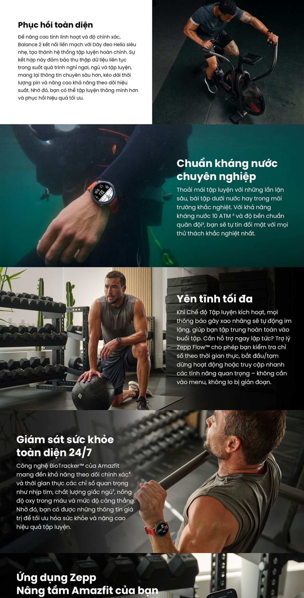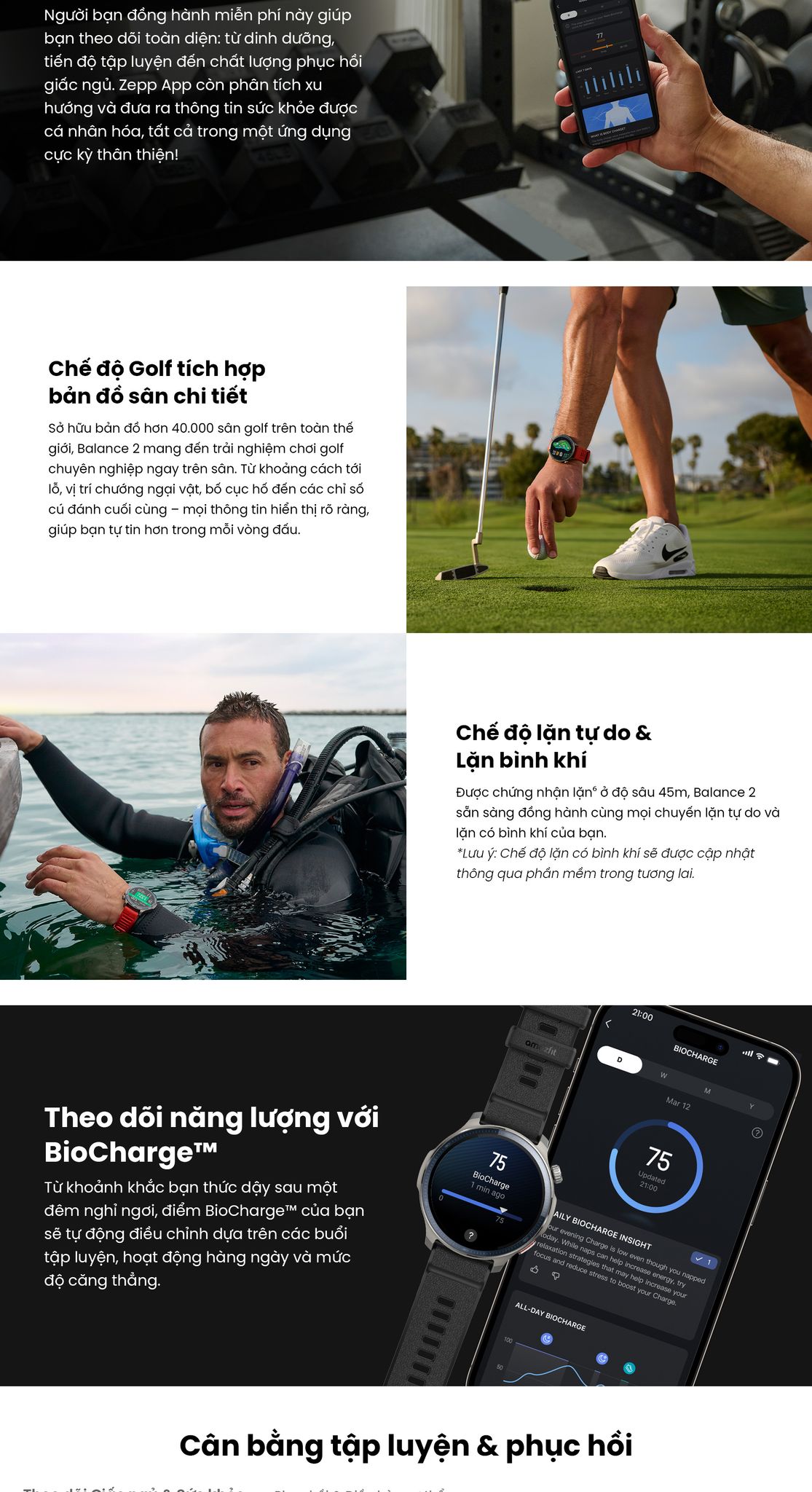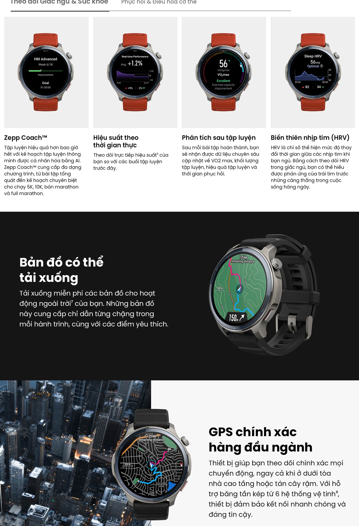 - Ứng dụng Zepp giúp bạn theo dõi toàn diện: từ dinh dưỡng, tiến độ tập luyện đến chất lượng phục hồi giấc ngủ.