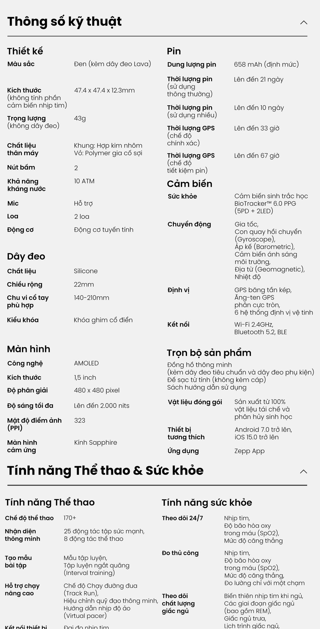 - Điều khiển bằng giọng nói: Zepp Flow™ cho phép toàn quyền kiểm soát đồng hồ chỉ bằng giọng nói. Bạn dễ dàng tùy chỉnh cài đặt, xem tiến trình Zepp Coach™ hay kiểm tra điểm sẵn sàng mà không cần chạm, vuốt hay ghi nhớ lệnh.