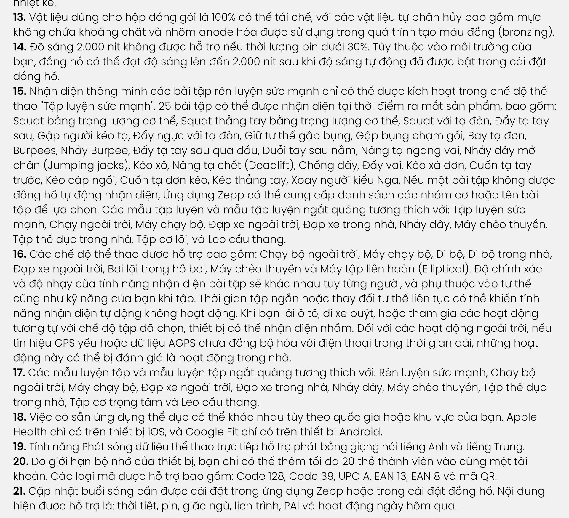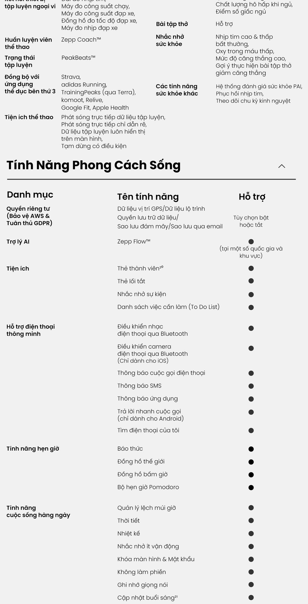 - Zepp Coach™: Tập luyện hiệu quả hơn bao giờ hết với kế hoạch tập luyện thông minh được cá nhân hóa bằng AI. Zepp Coach™ cung cấp đa dạng chương trình, từ bài tập tổng quát đến kế hoạch chuyên biệt cho chạy 5K, 10K, bán marathon và full marathon.