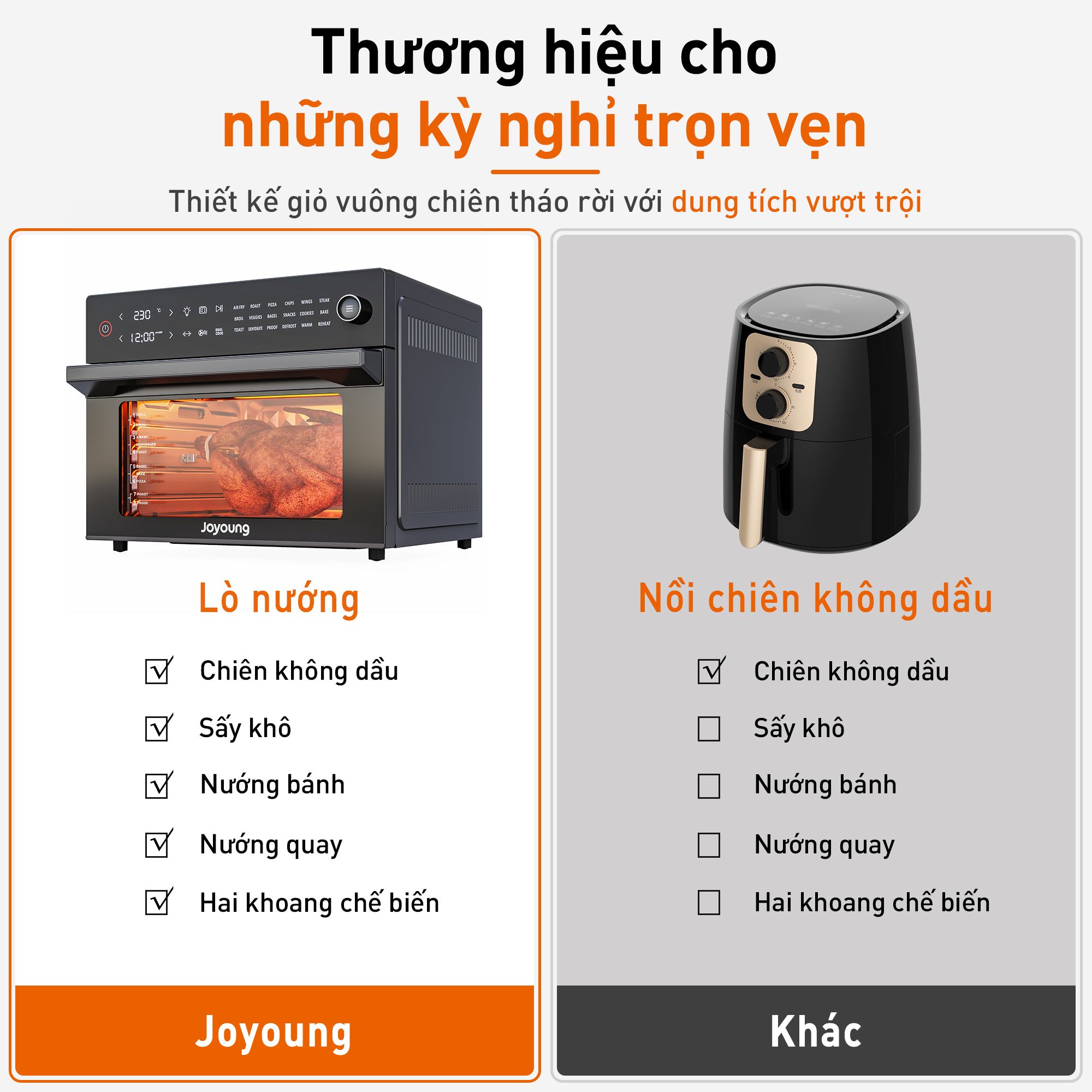 - 8 tính năng hữu ích: Nướng áp chảo, nướng pizza, chiên không dầu, sấy khô, nướng bánh, ủ bột, rã đông, giữ ấm.