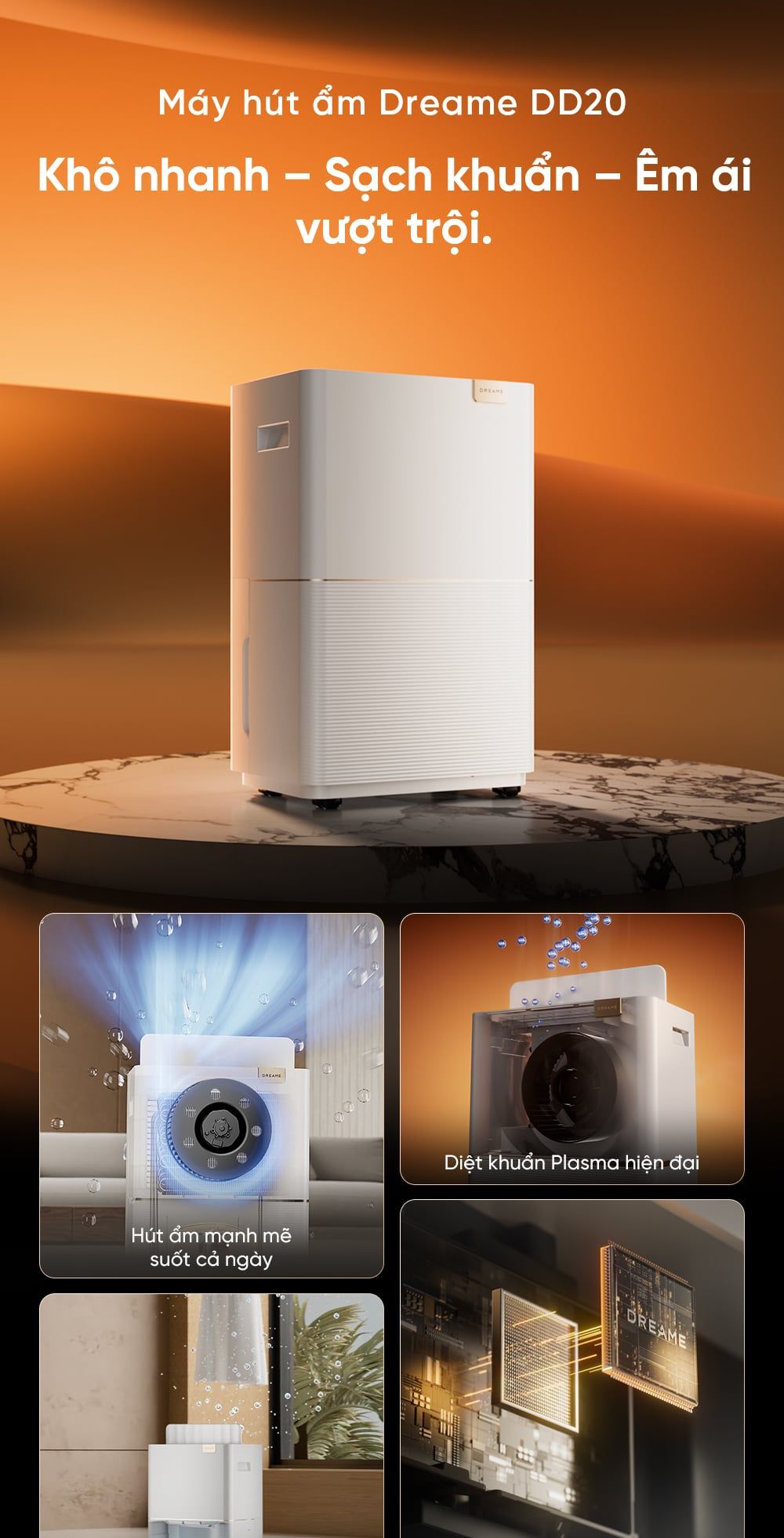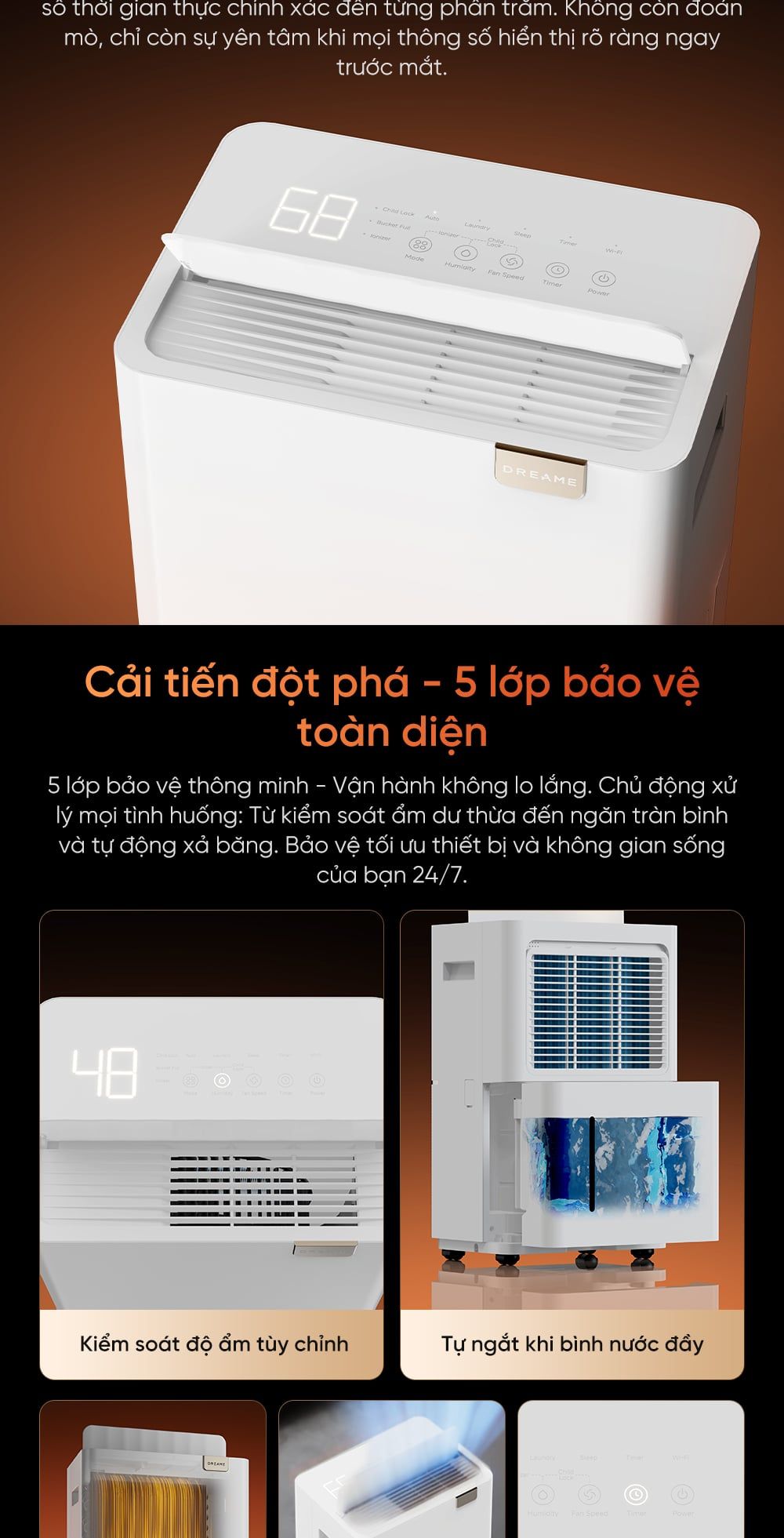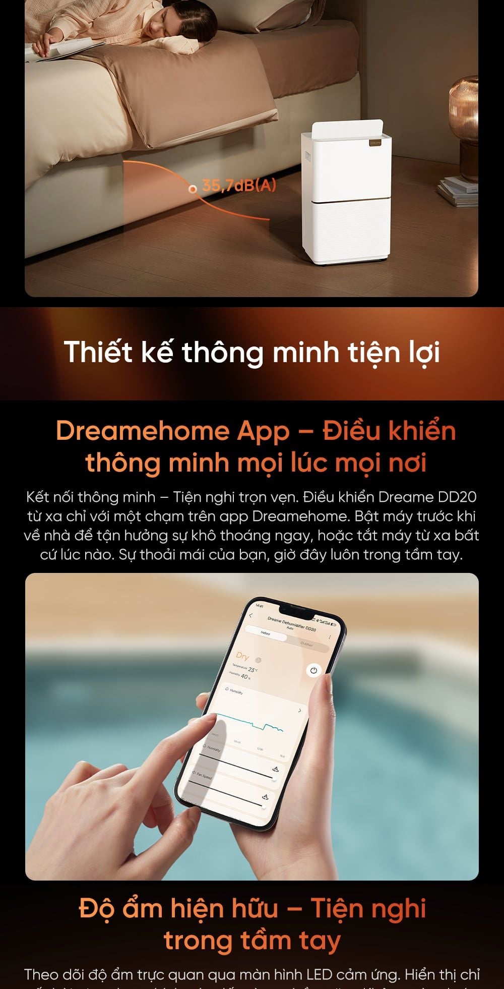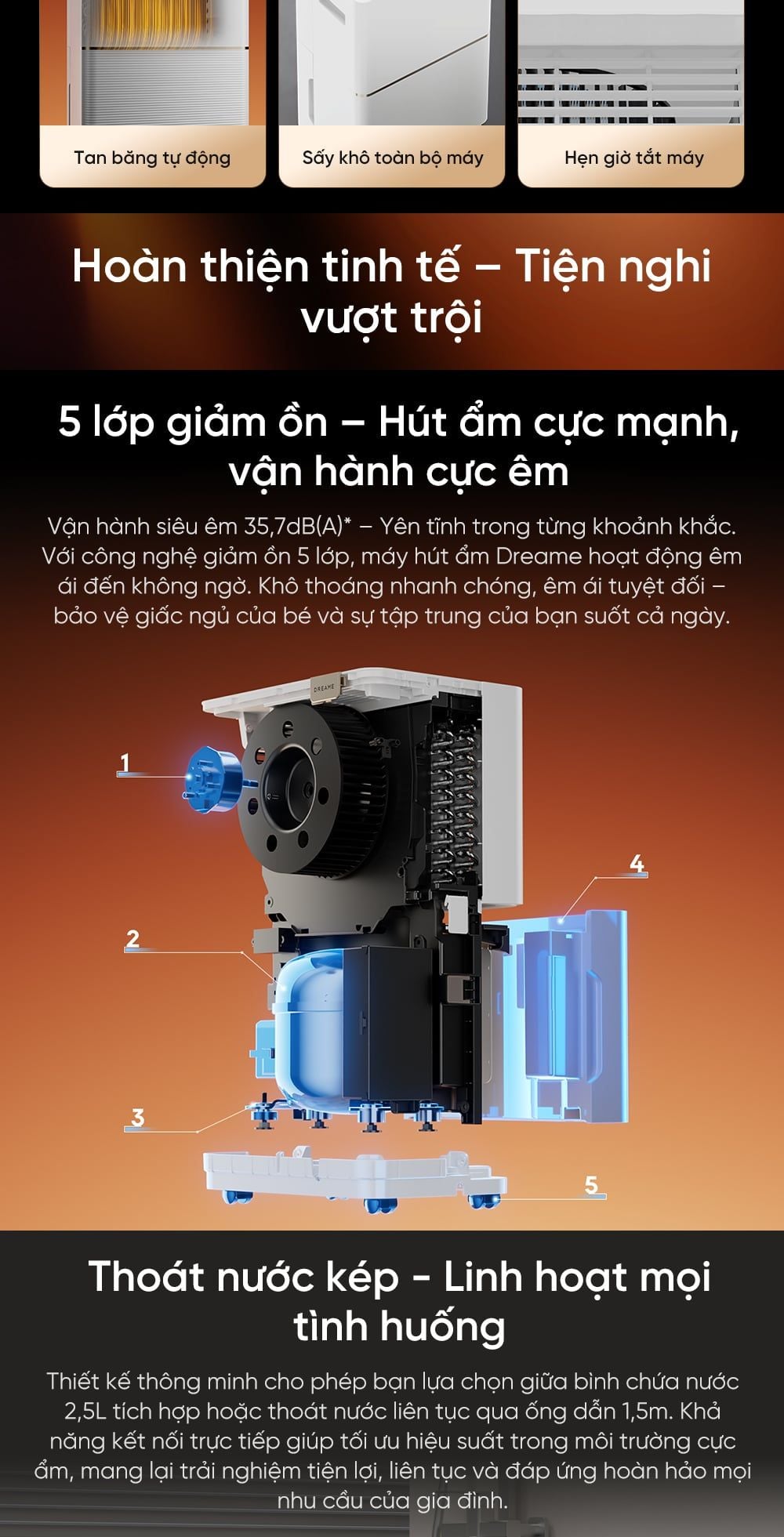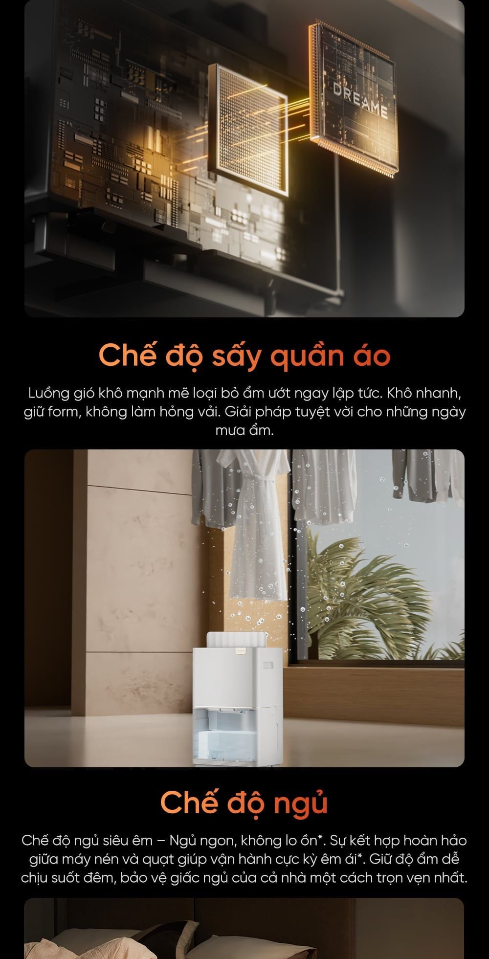 - Vận hành siêu êm 35,7dB(A): Yên tĩnh trong từng khoảnh khắc. Với công nghệ giảm ồn 5 lớp, máy hút ẩm Dreame hoạt động êm ái đến không ngờ. Khô thoáng nhanh chóng, êm ái tuyệt đối – bảo vệ giấc ngủ của bé và sự tập trung của bạn suốt cả ngày.