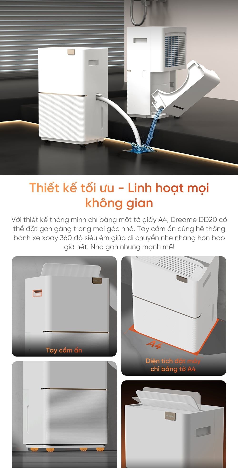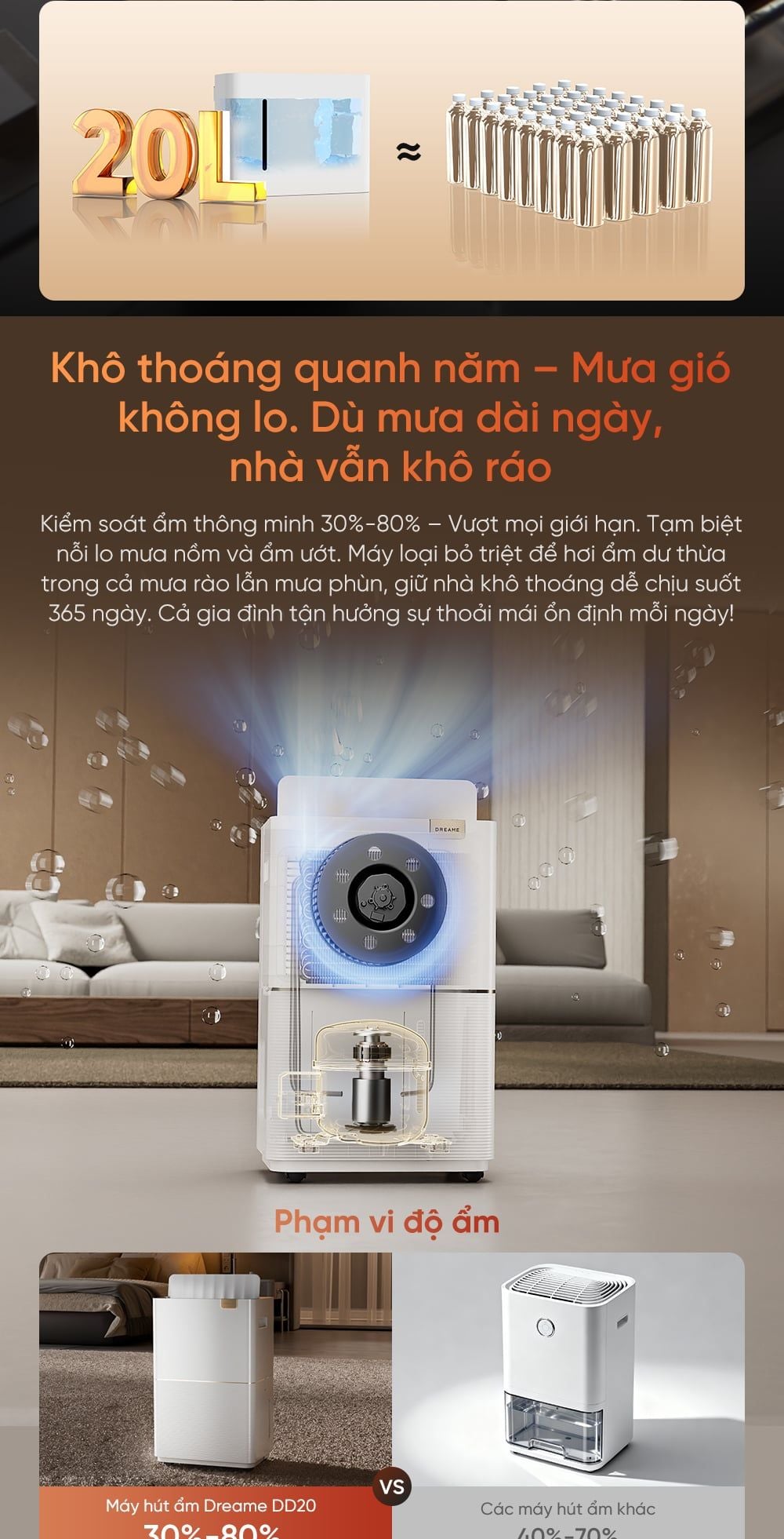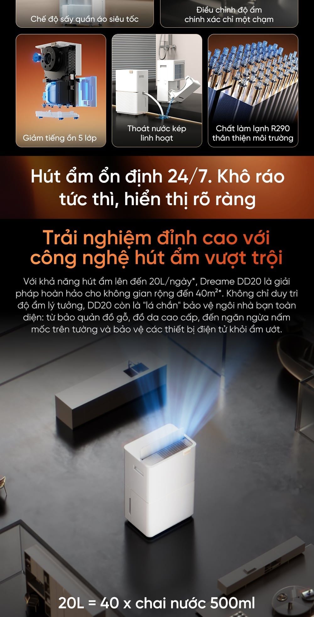 - Với khả năng hút ẩm lên đến 20L/ngày, Dreame DD20 là giải pháp hoàn hảo cho không gian rộng đến 40m².