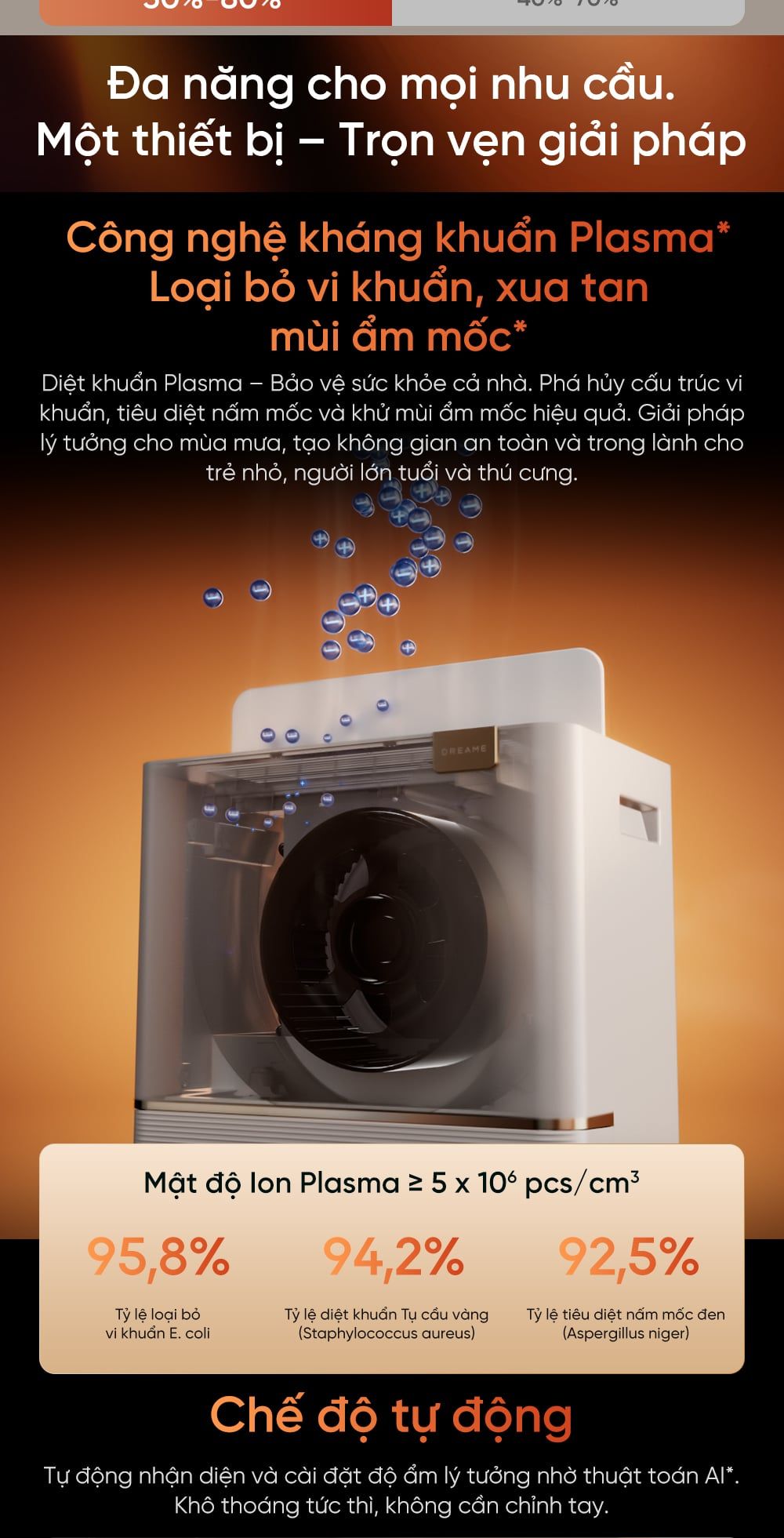 - Kiểm soát ẩm thông minh 30%-80% – Vượt mọi giới hạn. Tạm biệt nỗi lo mưa nồm và ẩm ướt. Máy loại bỏ triệt để hơi ẩm dư thừa trong cả mưa rào lẫn mưa phùn, giữ nhà khô thoáng dễ chịu suốt 365 ngày.