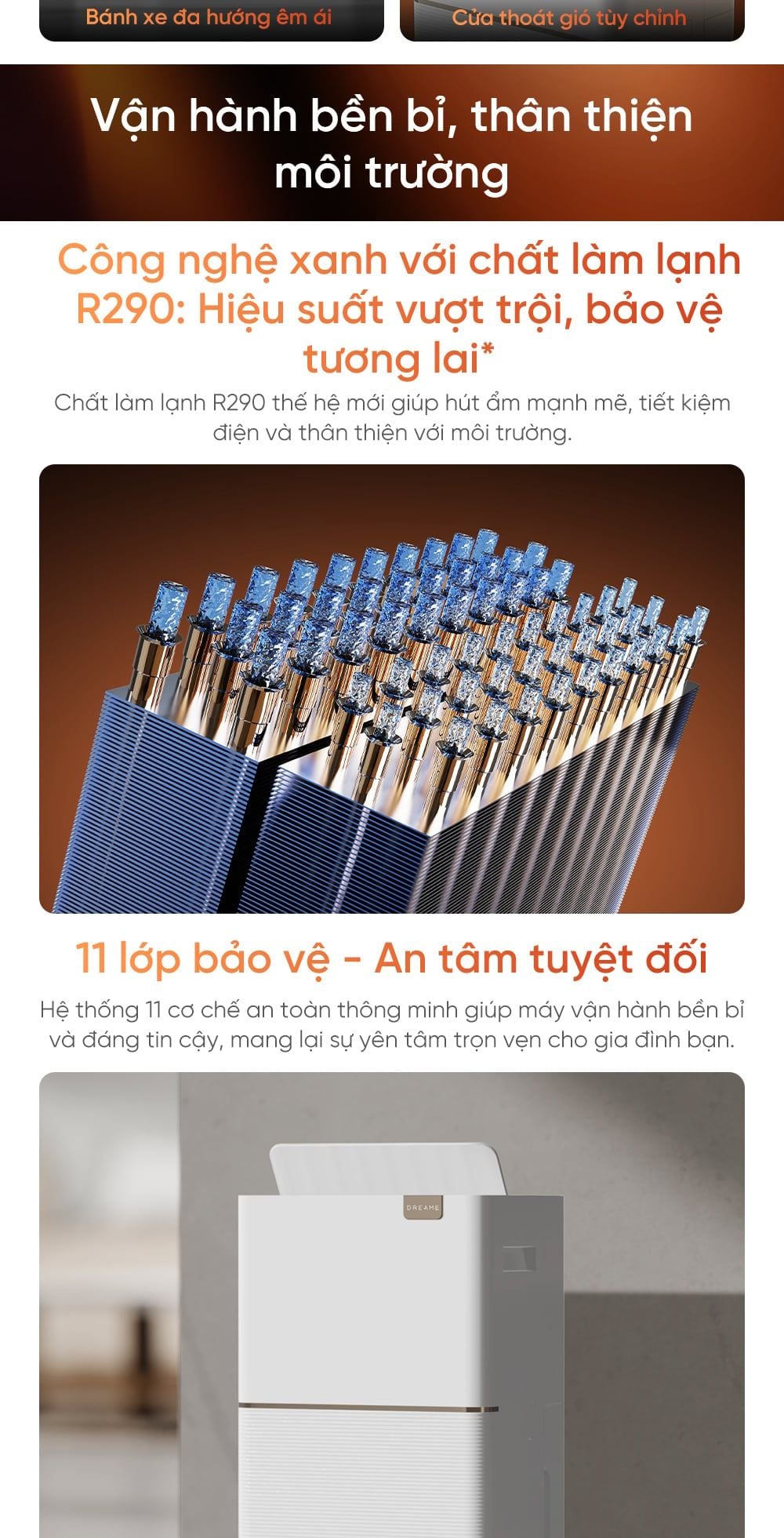 - Chất làm lạnh R290 thế hệ mới giúp hút ẩm mạnh mẽ, tiết kiệm điện và thân thiện với môi trường.