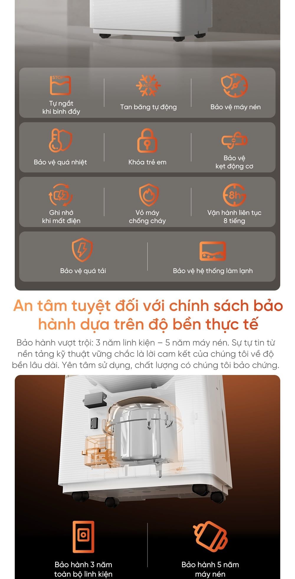 - 5 lớp bảo vệ thông minh - Vận hành không lo lắng. Chủ động xử lý mọi tình huống: Từ kiểm soát ẩm dư thừa đến ngăn tràn bình và tự động xả băng. Bảo vệ tối ưu thiết bị và không gian sống của bạn 24/7.