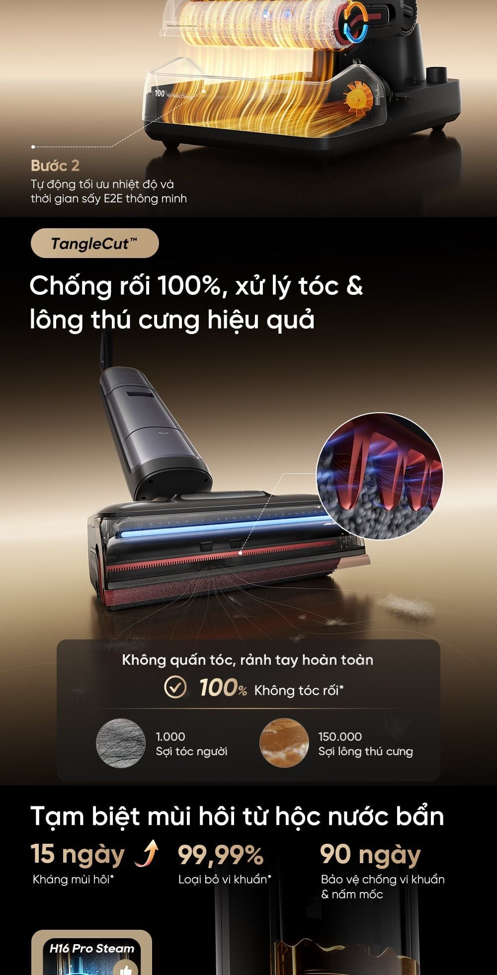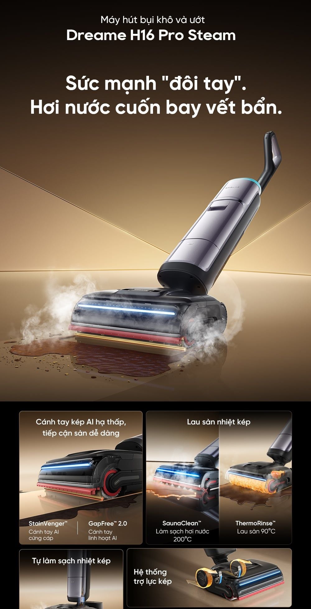 - Làm sạch chính xác, điều chỉnh dung dịch thông minh: H16 Pro Steam tự động pha dung dịch và chỉnh lực hút phù hợp – nhẹ nhàng với vết bẩn thường, mạnh mẽ với vết dầu mỡ.
