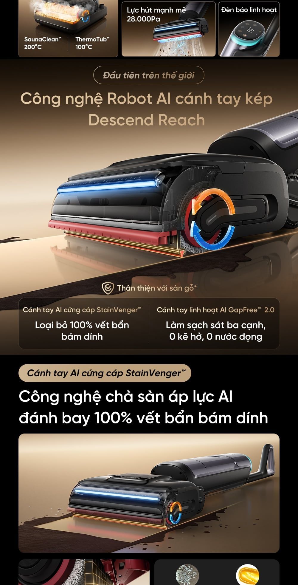 - Công nghệ Robot AI cánh tay kép Descend Reach đầu tiên trên thế giới: Gồm Cánh tay AI cứng cáp StainVenger™ và Cánh tay linh hoạt AI GapFree™ 2.0