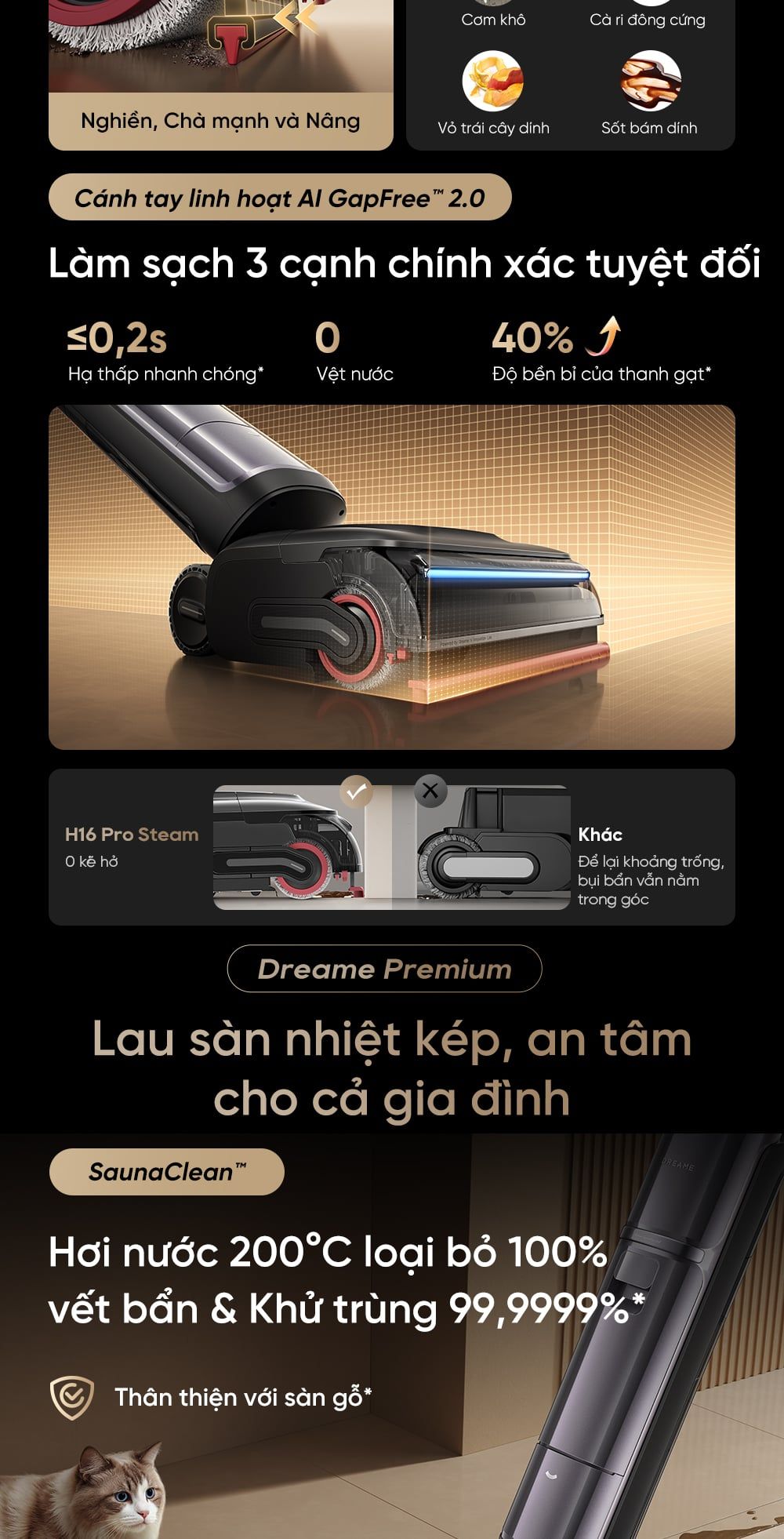- Cánh tay linh hoạt AI GapFree™ 2.0: Làm sạch sát ba cạnh, 0 kẽ hở, 0 nước đọng.