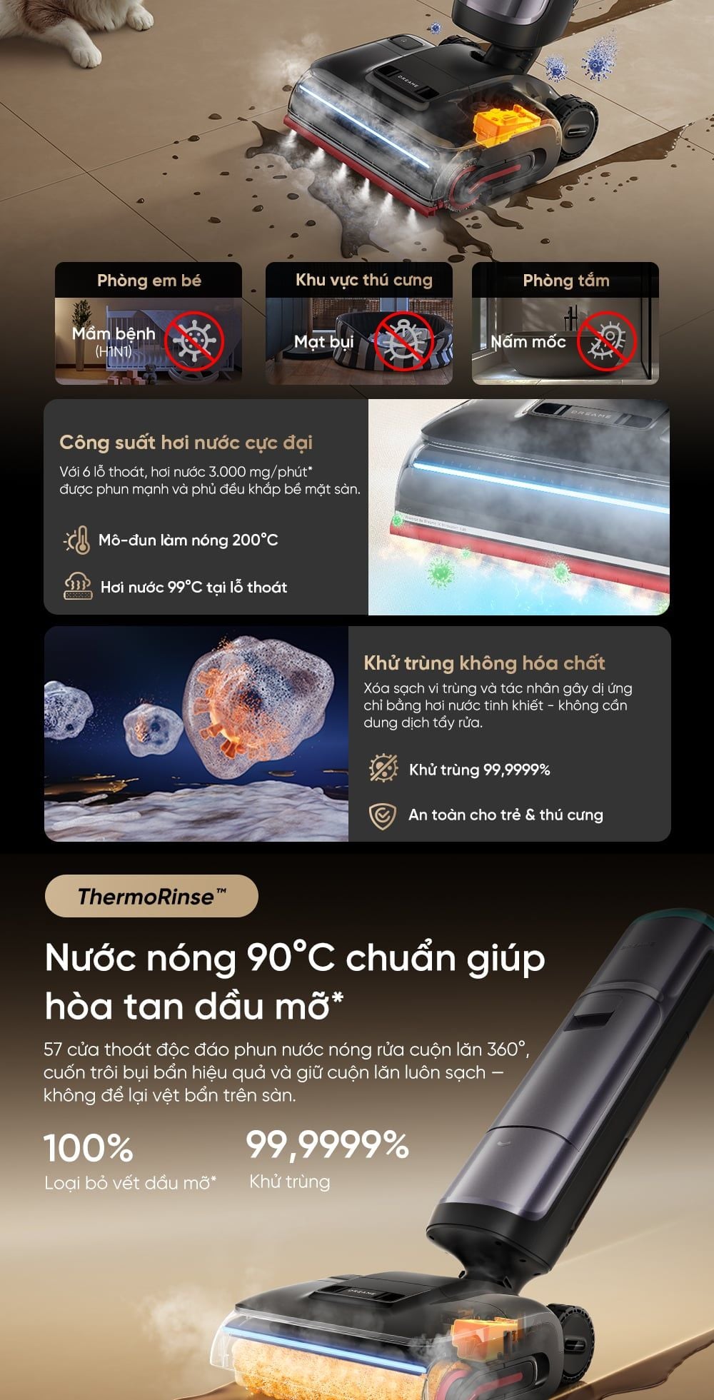 - Công nghệ ThermoRinse™ nước nóng 90°C chuẩn giúp hòa tan dầu mỡ*: 57 cửa thoát độc đáo phun nước nóng rửa cuộn lăn 360°, cuốn trôi bụi bẩn hiệu quả và giữ cuộn lăn luôn sạch — không để lại vệt bẩn trên sàn.
