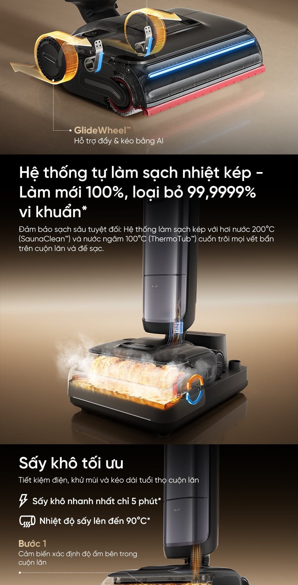 - Hệ thống tự làm sạch nhiệt kép: Hệ thống làm sạch kép với hơi nước 200°C (SaunaClean™) và nước ngâm 100°C (ThermoTub™) cuốn trôi mọi vết bẩn trên cuộn lăn và đế sạc.