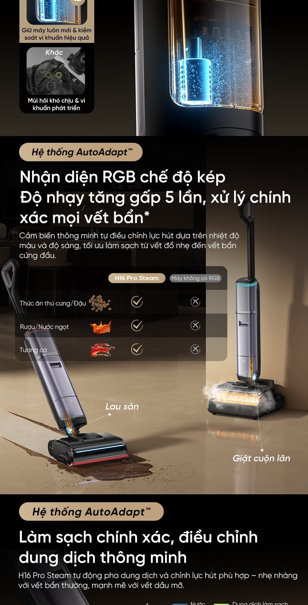 - Hệ thống AutoAdapt™: Nhận diện RGB chế độ kép thông minh và làm sạch chính xác nhờ công nghệ điều chỉnh dung dịch.