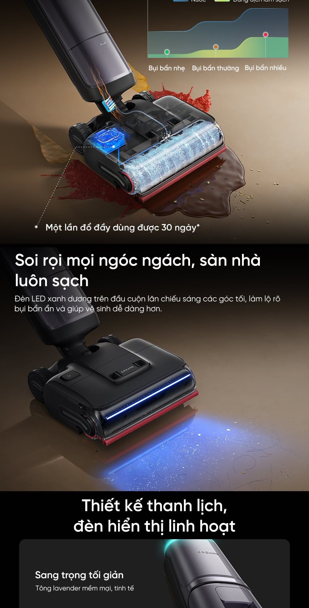 - Đèn LED xanh dương trên đầu cuộn lăn: Chiếu sáng các góc tối, làm lộ rõ bụi bẩn ẩn và giúp vệ sinh dễ dàng hơn.