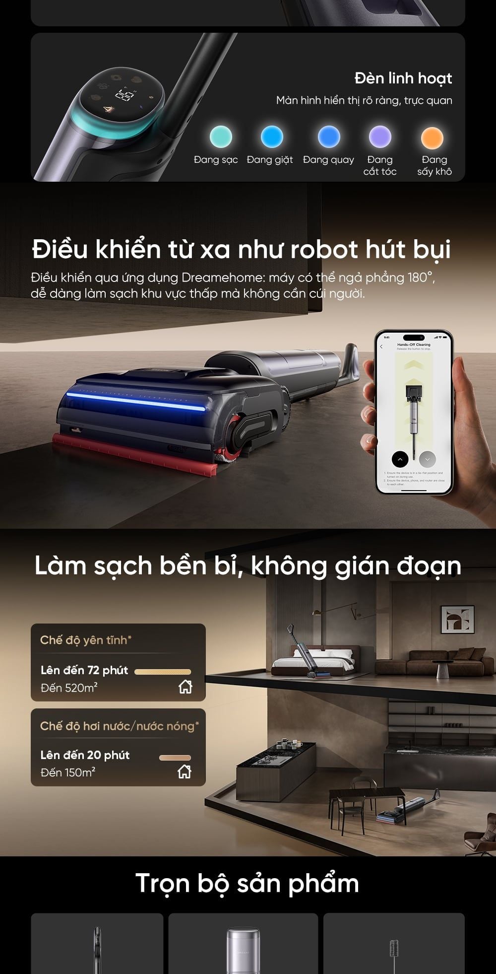 - Điều khiển qua ứng dụng Dreamehome: Máy có thể ngả phẳng 180°, dễ dàng làm sạch khu vực thấp mà không cần cúi người.
