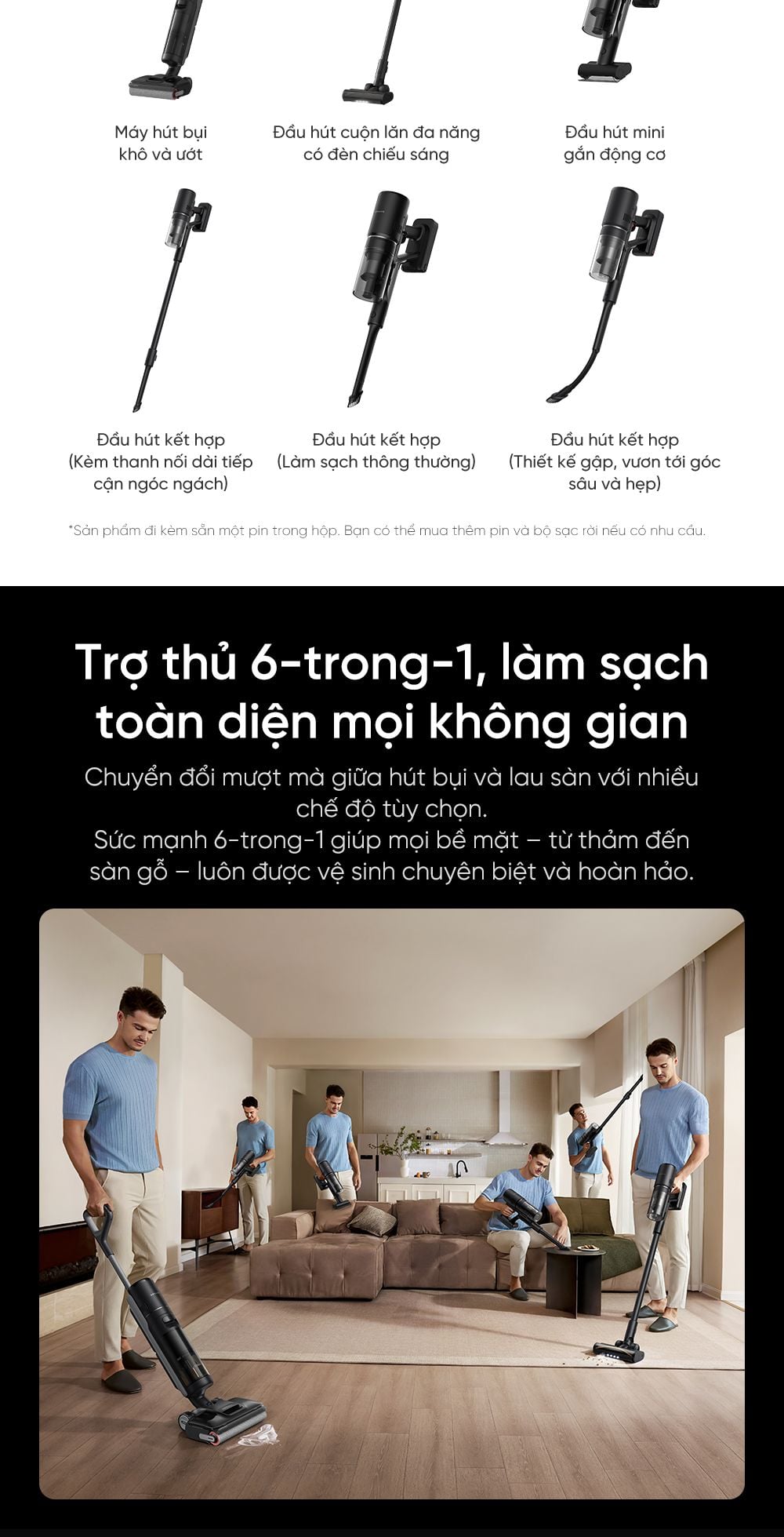 Trợ thủ 6-trong-1, làm sạch toàn diện mọi không gian: Chuyển đổi mượt mà giữa hút bụi và lau sàn với nhiều chế độ tùy chọn. Sức mạnh 6-trong-1 giúp mọi bề mặt - từ thảm đến sàn gỗ, luôn được vệ sinh chuyên biệt và hoàn hảo.