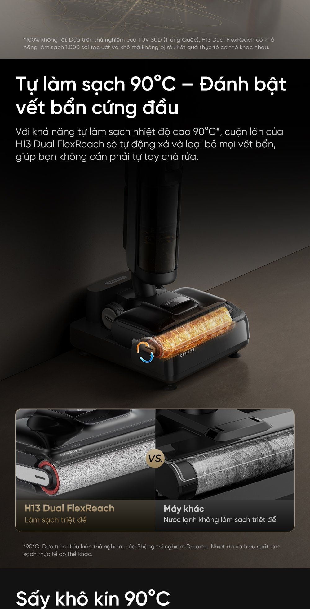 Tự làm sạch 90°C: cuộn lăn của H13 Dual FlexReach sẽ tự động xả và loại bỏ mọi vết bẩn, giúp bạn không cần phải tự tay chà rửa.