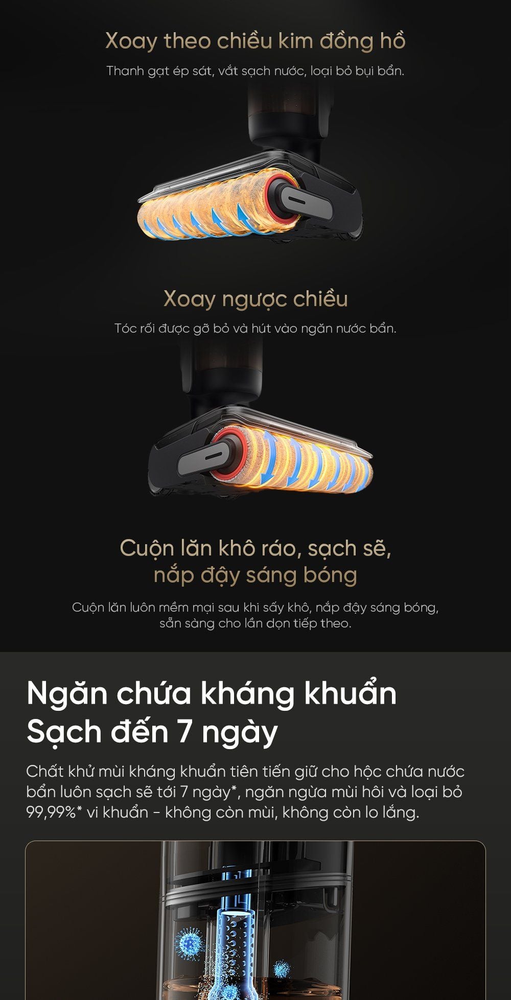 Ngăn chứa kháng khuẩn – Sạch đến 7 ngày: Chất khử mùi kháng khuẩn tiên tiến giữ cho hộc chứa nước bẩn luôn sạch sẽ tới 7 ngày, ngăn ngừa mùi hôi và loại bỏ 99,99% vi khuẩn - không còn mùi, không còn lo lắng.