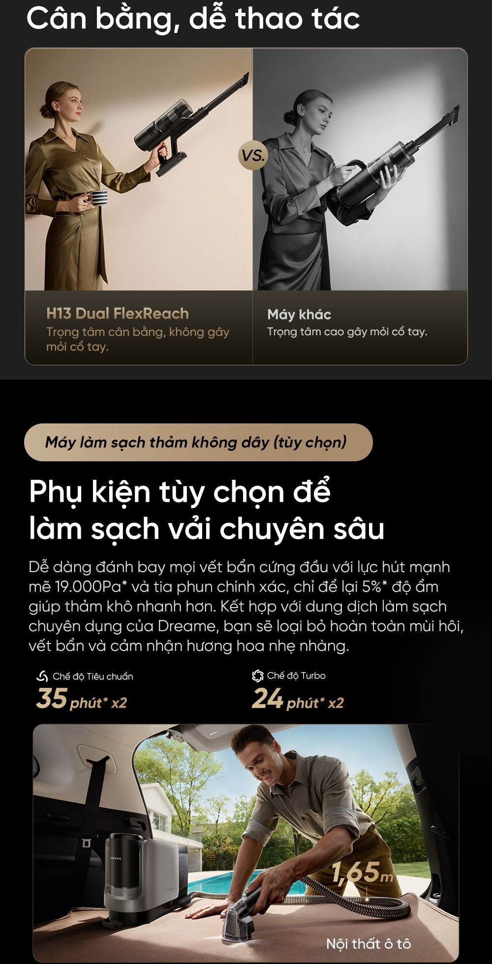 Lực hút 23.000Pa: H13 Dual FlexReach sở hữu lực hút cực mạnh, dễ dàng đánh bật bụi khô lẫn chất lỏng. Từ sợi mì, hạt cà phê đến dầu mỡ bám bếp, mọi vết bẩn đều biến mất tức thì.