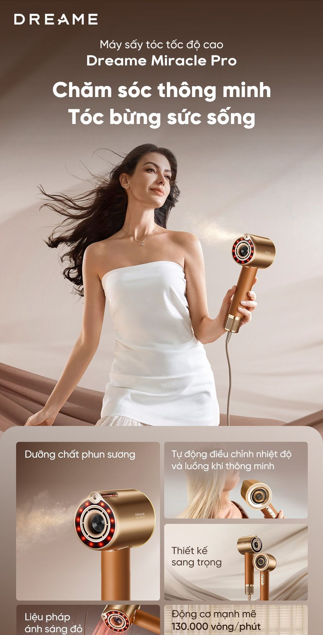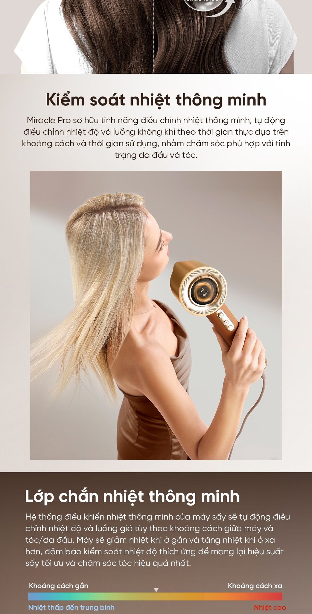 Kiểm soát nhiệt thông minh: Miracle Pro sở hữu tính năng điều chỉnh nhiệt thông minh, tự động điều chỉnh nhiệt độ và luồng không khí theo thời gian thực dựa trên khoảng cách và thời gian sử dụng, nhằm chăm sóc phù hợp với tình trạng da đầu và tóc.