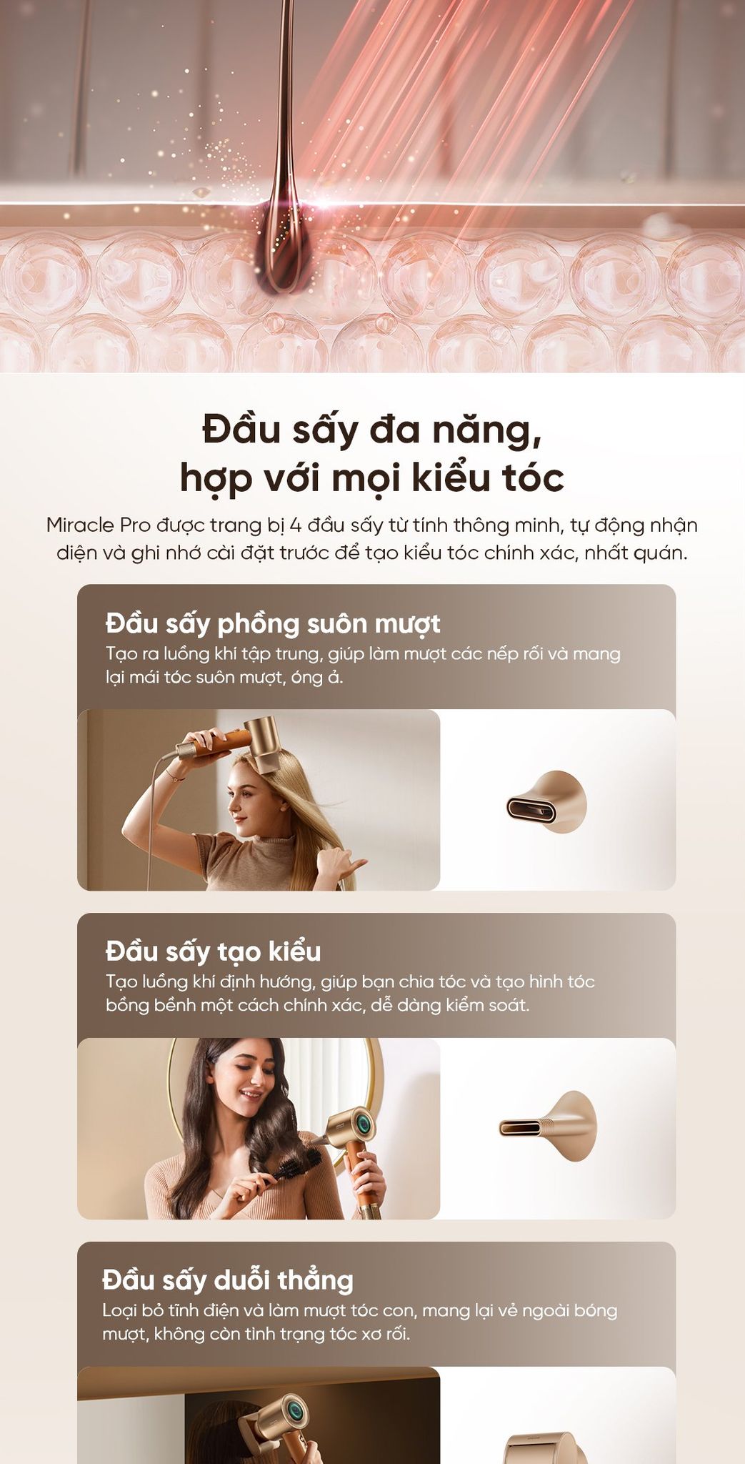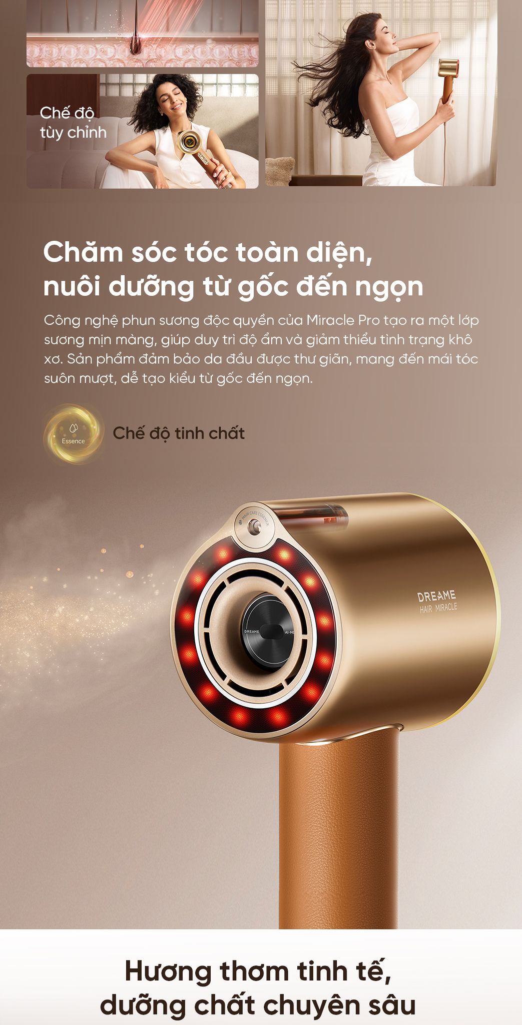 Chăm sóc tóc toàn diện, nuôi dưỡng từ gốc đến ngọn: Công nghệ phun sương độc quyền của Miracle Pro tạo ra một lớp sương mịn màng, giúp duy trì độ ẩm và giảm thiểu tình trạng khô xơ.
