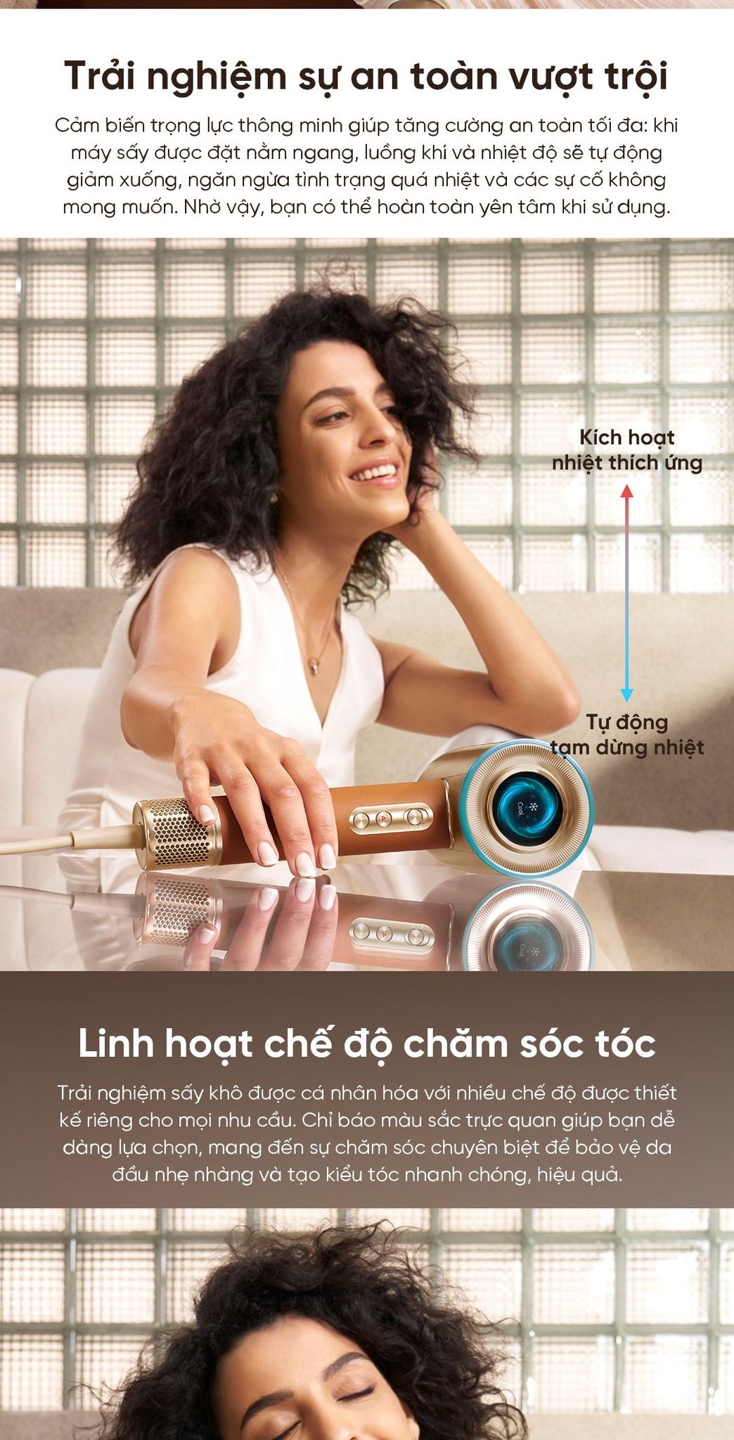Lớp chắn nhiệt thông minh: Hệ thống điều khiển nhiệt thông minh của máy sấy sẽ tự động điều chỉnh nhiệt độ và luồng gió tùy theo khoảng cách giữa máy và tóc/da đầu. Máy sẽ giảm nhiệt khi ở gần và tăng nhiệt khi ở xa hơn, đảm bảo kiểm soát nhiệt độ thích ứng để mang lại hiệu suất sấy tối ưu và chăm sóc tóc hiệu quả nhất.