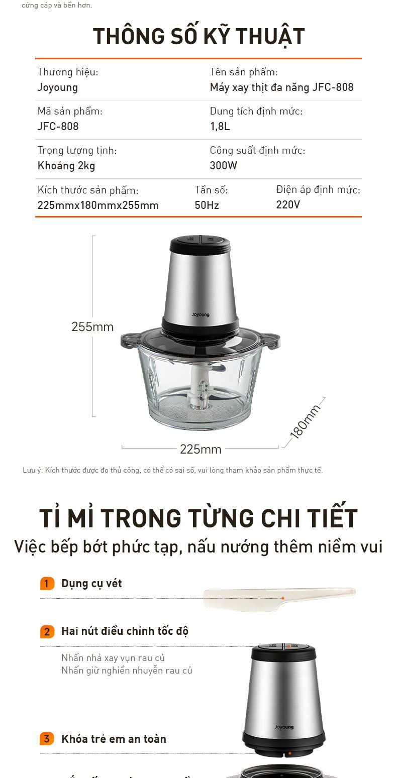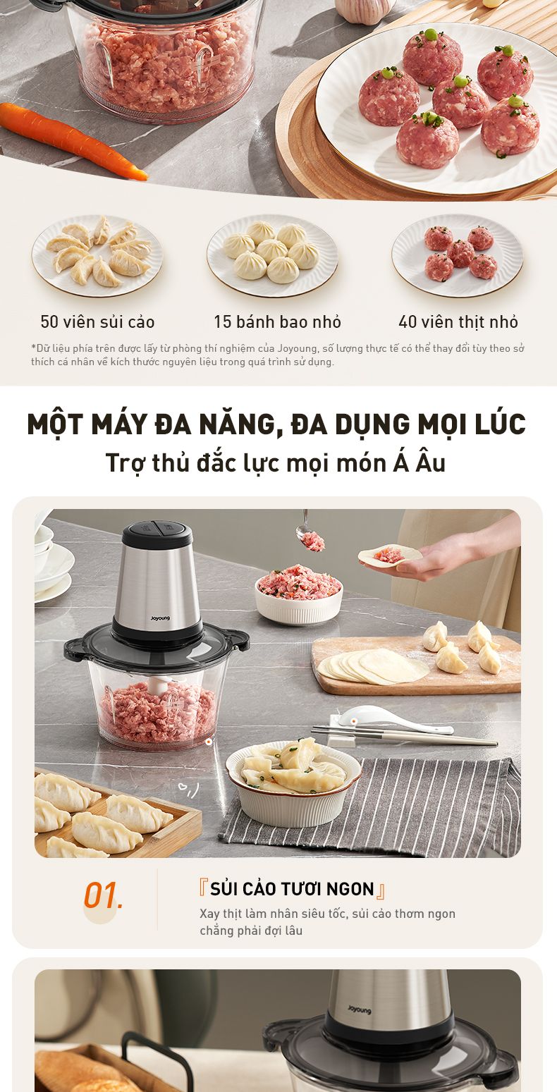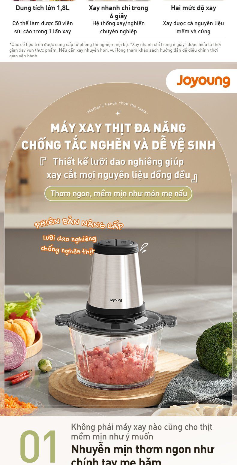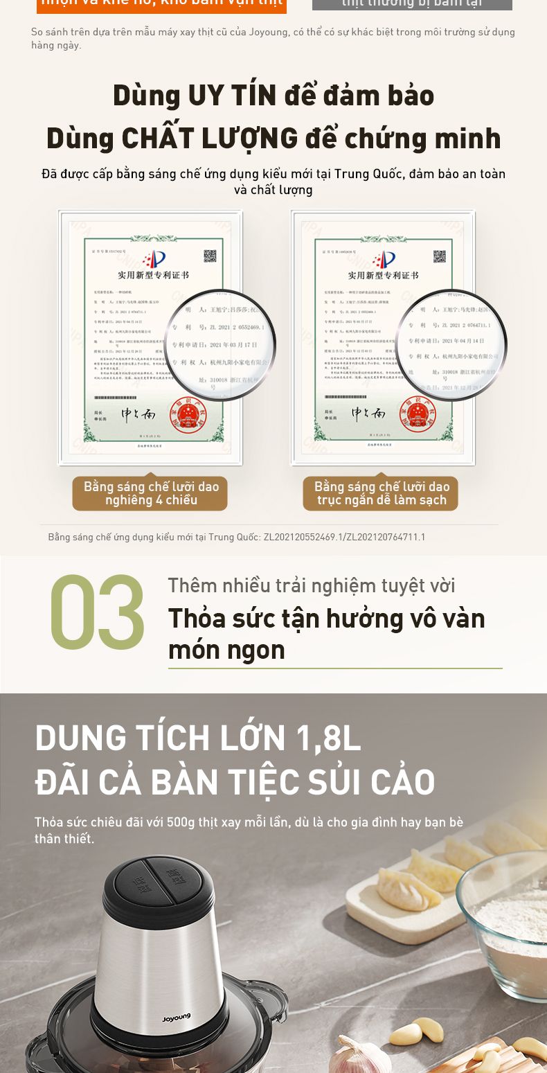 - Dung tích lớn 1,8L: Thỏa sức chiêu đãi mọi bữa tiệc với 500g thịt xay mỗi lần, "cân" mọi món Á Âu và là trợ thủ đắc lực phòng bếp.
