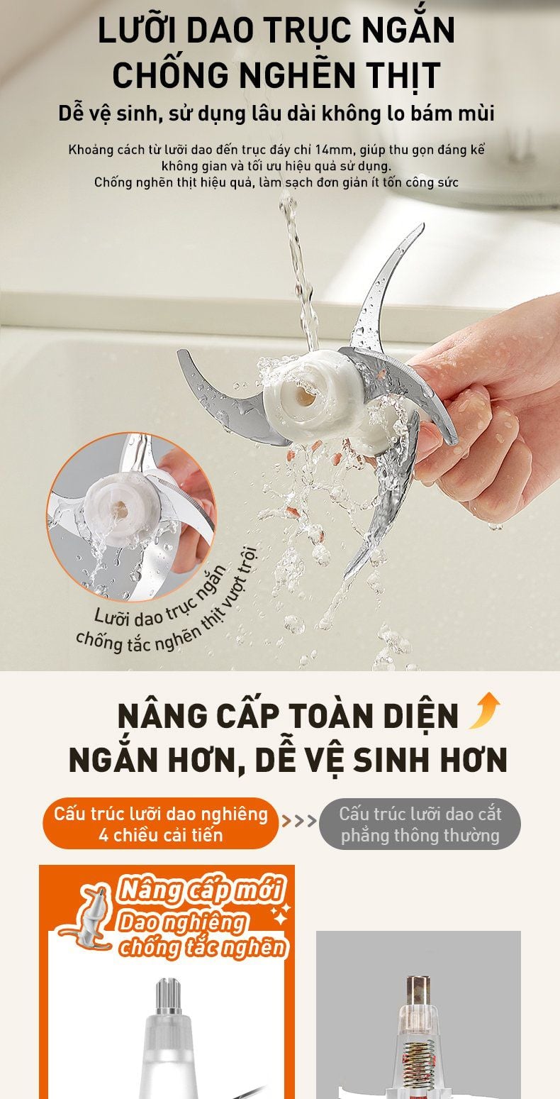 - Cấu trúc lưỡi dao nghiêng 4 chiều cải tiến: Lưỡi dao cách thành cối chỉ 6mm, cắt thực phẩm sát thành cối, cắt rau đồng đều và không để sót lại.