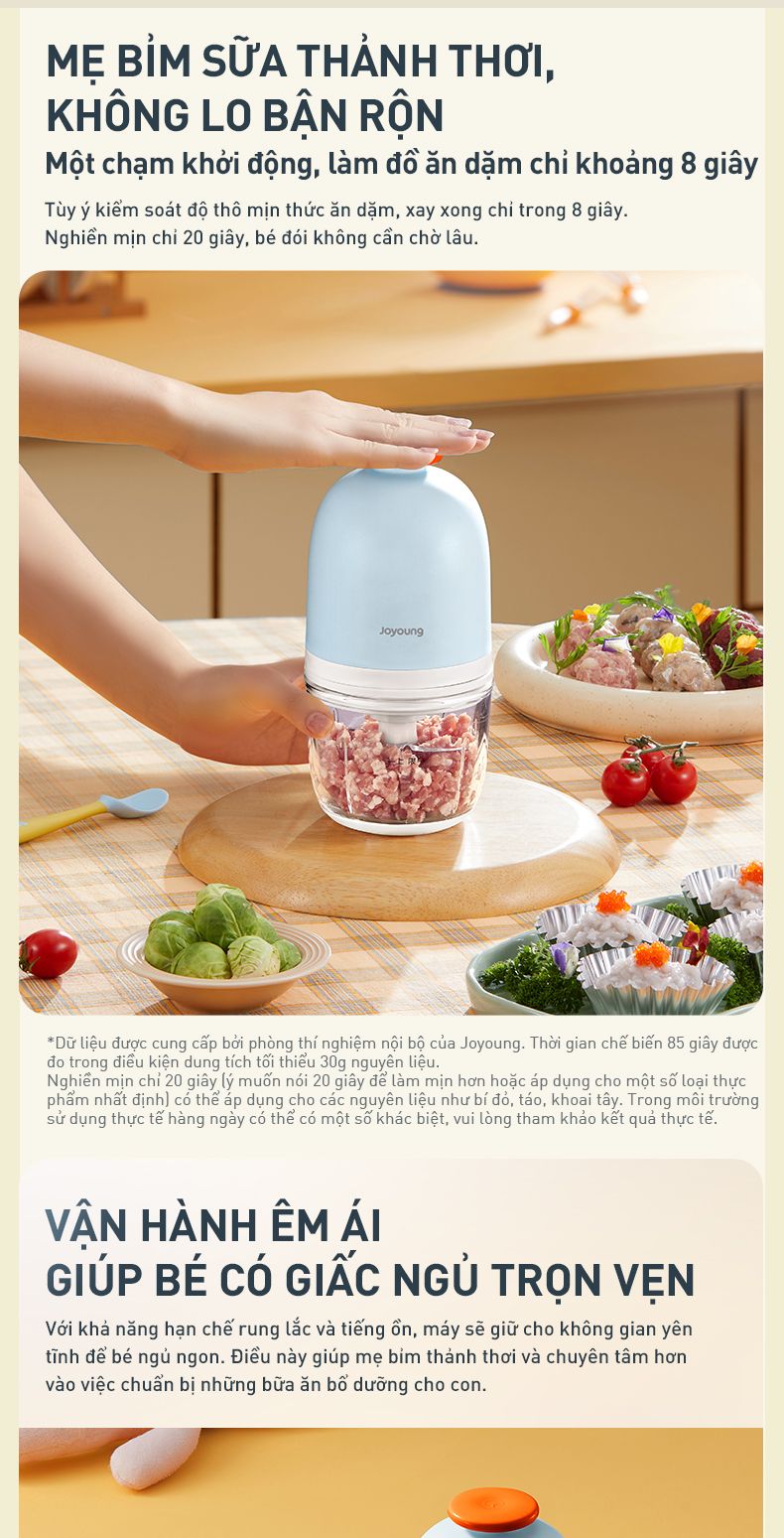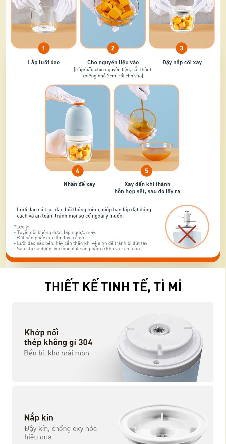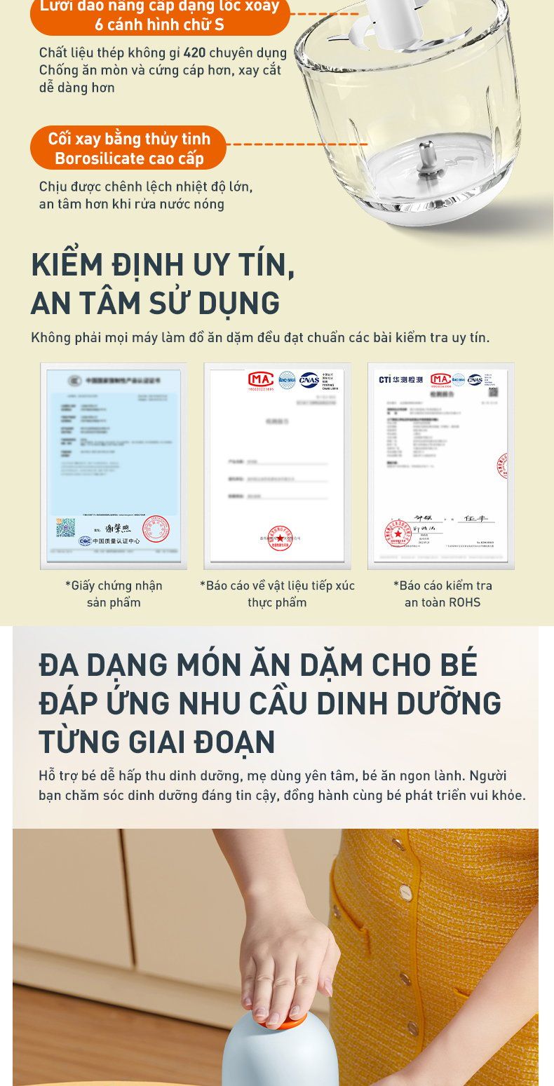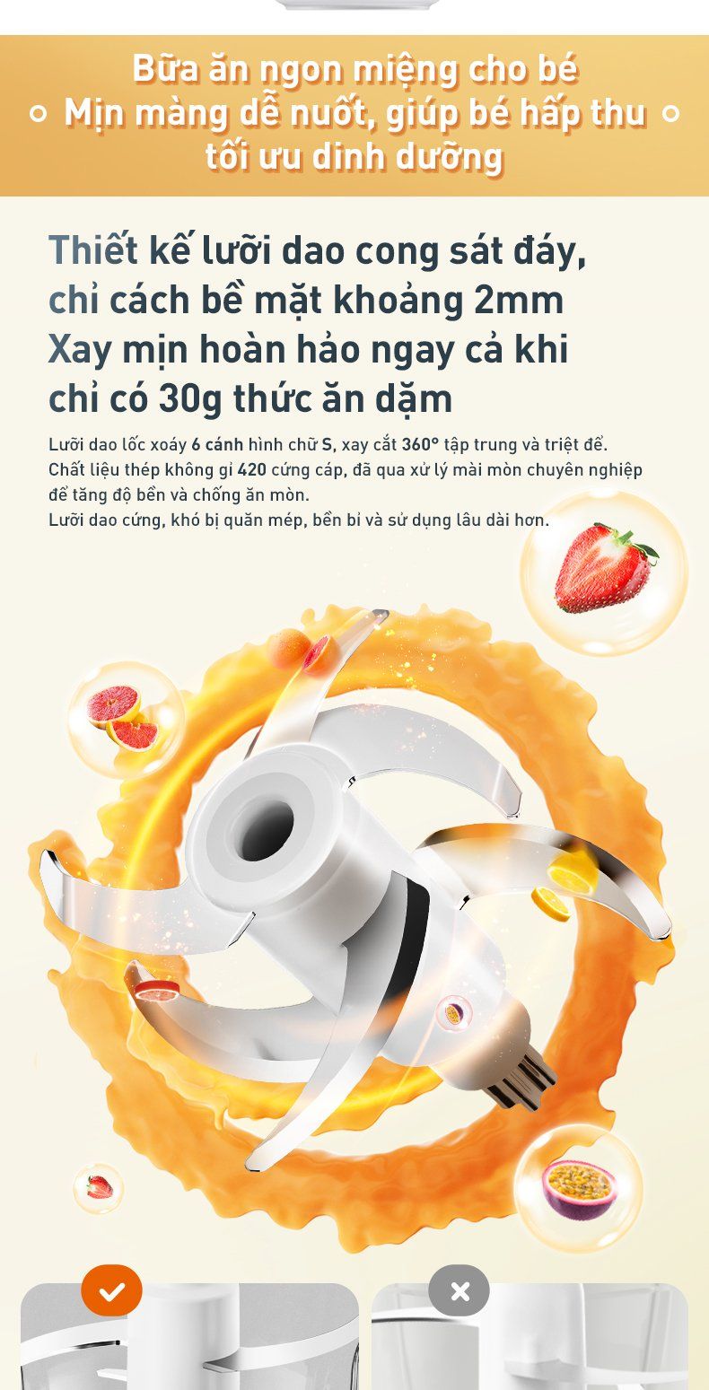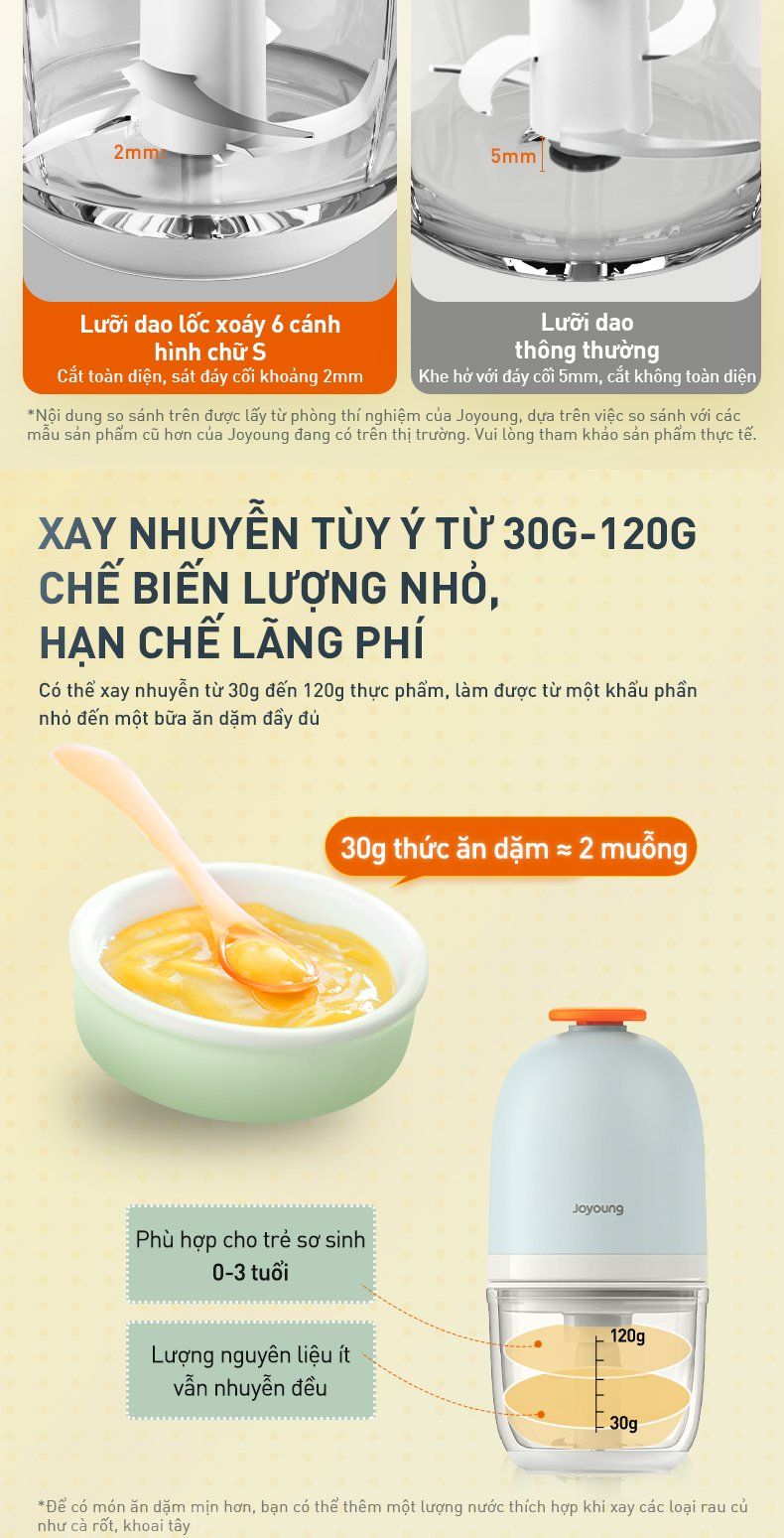 - Xay nhuyễn tùy ý từ 30g-120g: Làm được từ một khẩu phần nhỏ đến một bữa ăn dặm đầy đủ.