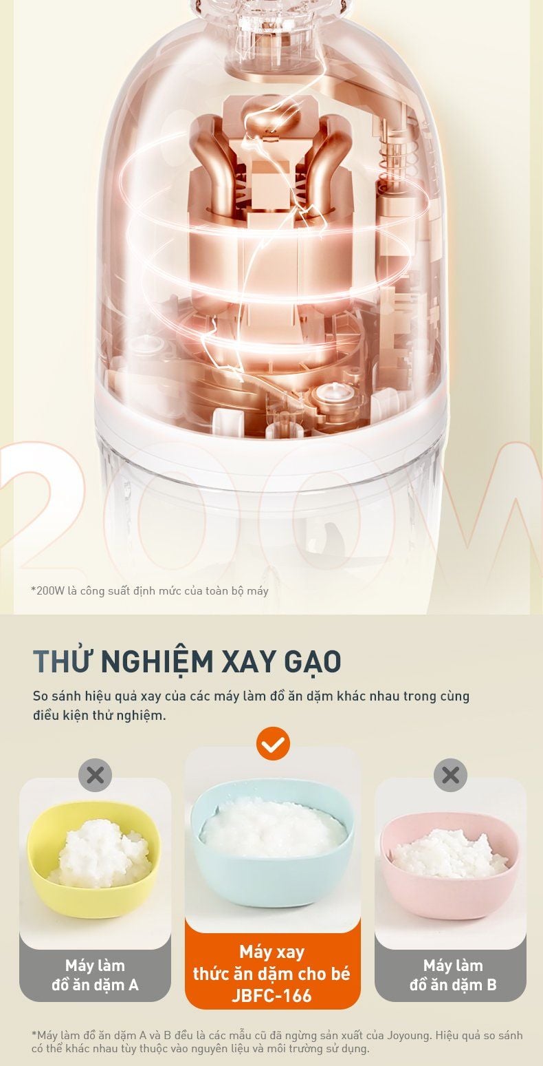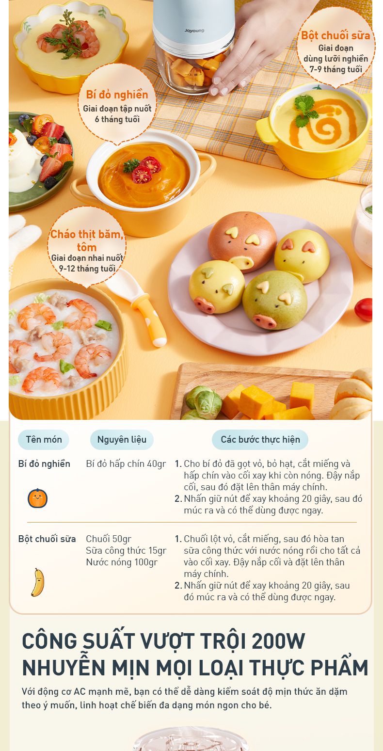 - Công suất vượt trội 200W: Động cơ AC mạnh mẽ, dễ dàng kiểm soát độ mịn thức ăn dặm theo ý muốn, linh hoạt chế biến đa dạng món ngon cho bé.