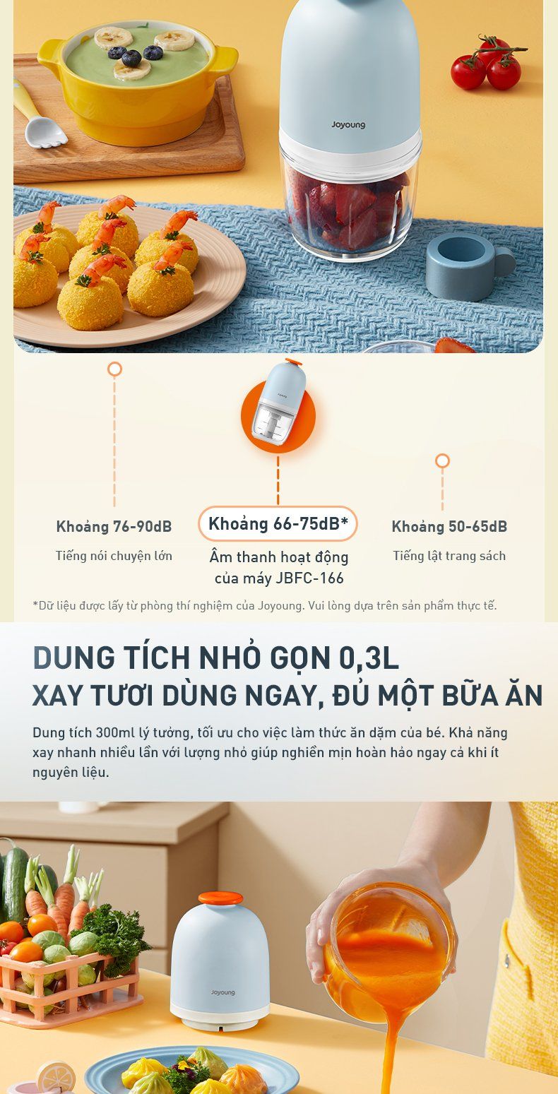 - Dung tích nhỏ gọn 0,3L: Tối ưu việc làm thức ăn dặm cho bé, khả năng xay nhanh nhiều lần với lượng nhỏ giúp nghiền mịn hoàn hảo ngay cả khi ít nguyên liệu.
