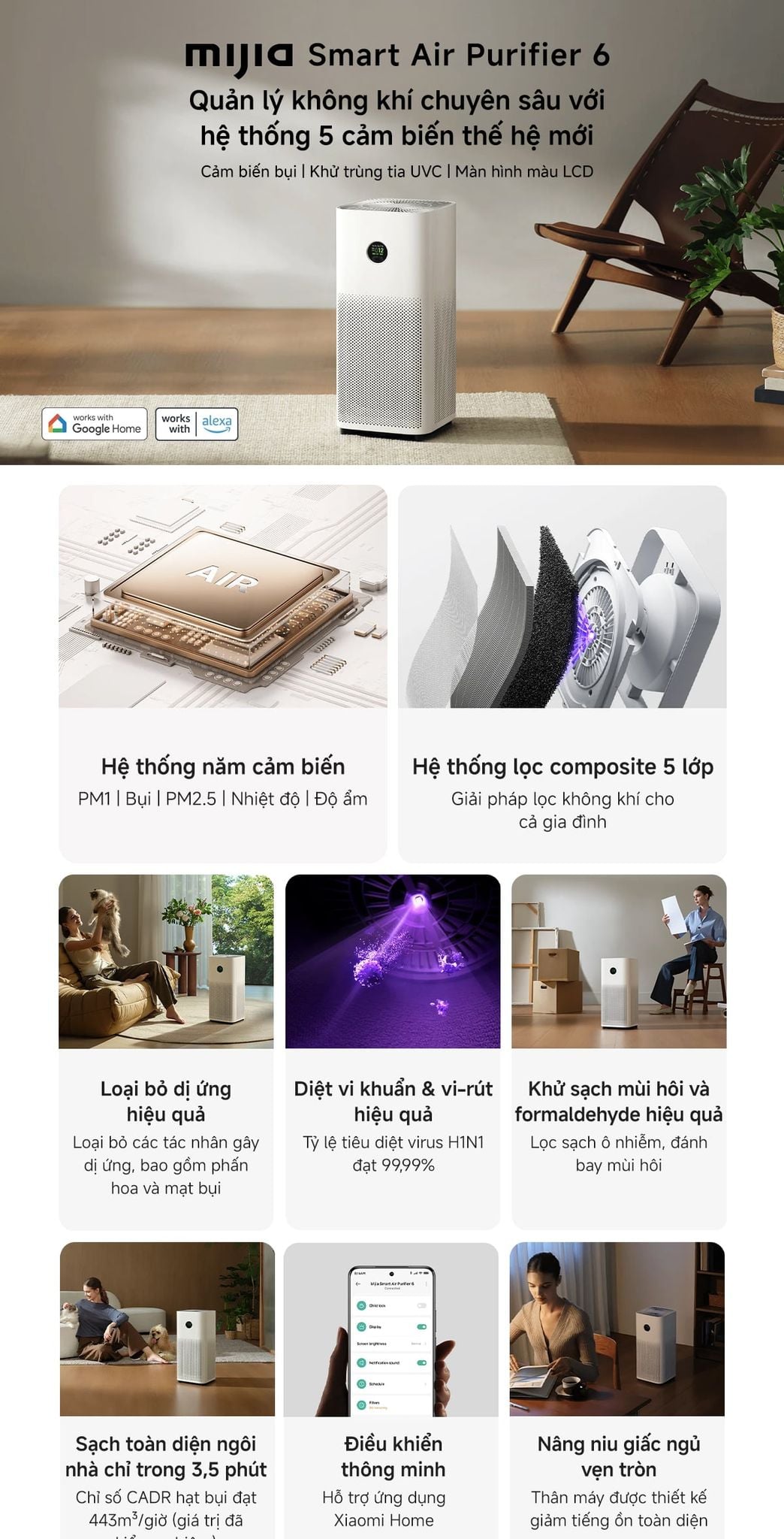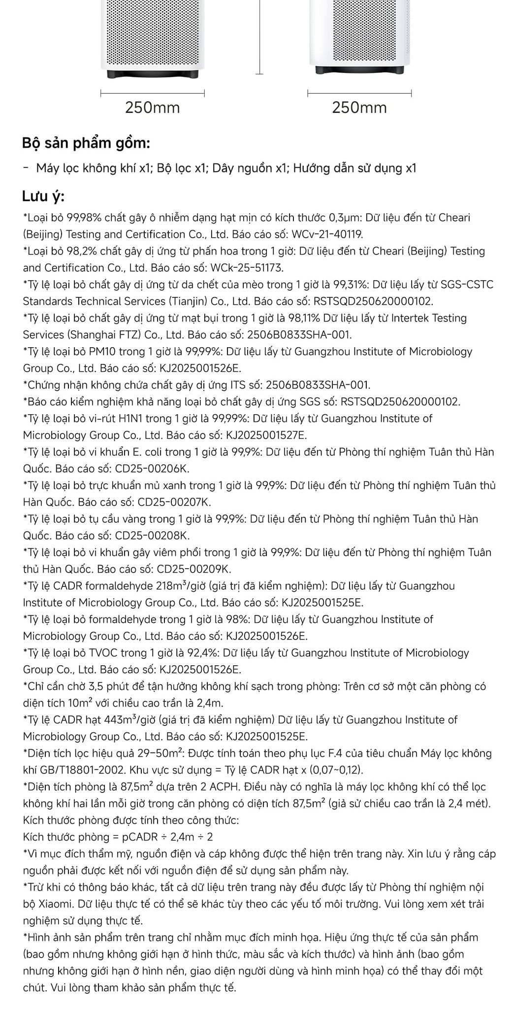 - Bộ lọc hiệu suất cao của xiaomi: Loại bỏ 99,98% chất gây ô nhiễm dạng bụi mịn 0,3μm*, chẳng hạn như PM2.5, phấn hoa và khói thuốc lá thụ động.