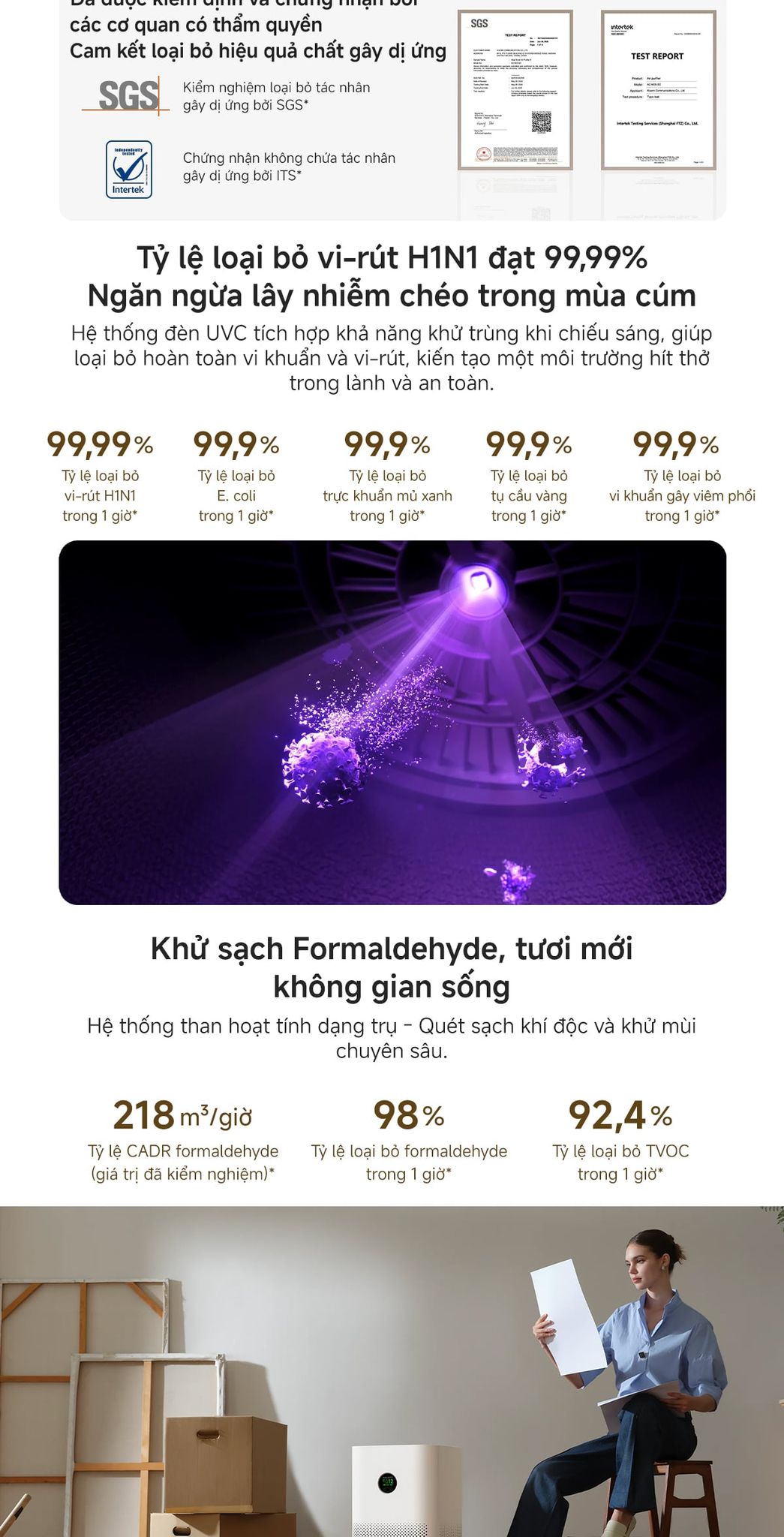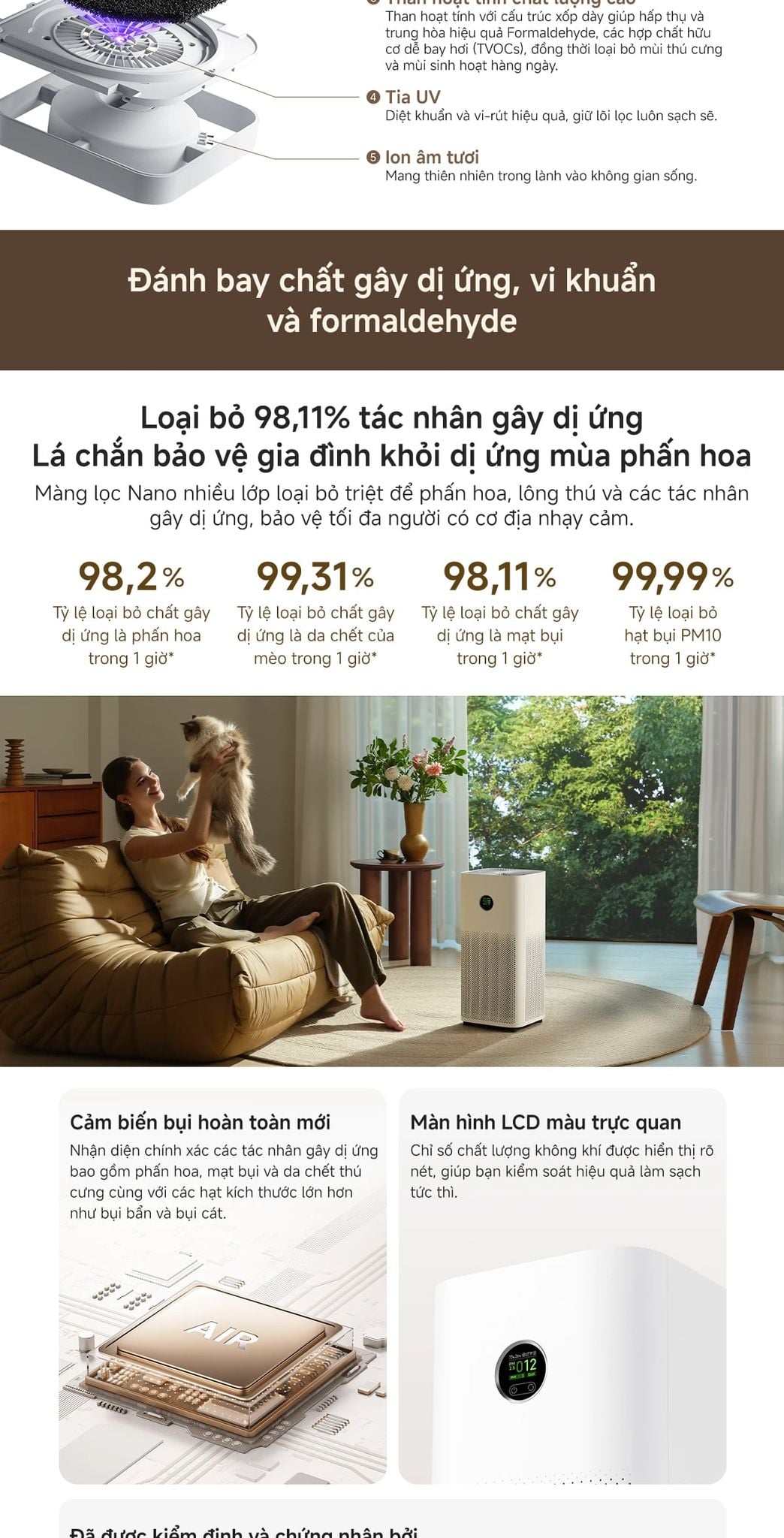 - Tỷ lệ loại bỏ mạt bụi gây dị ứng trong 1 giờ lên đến 98,11%.