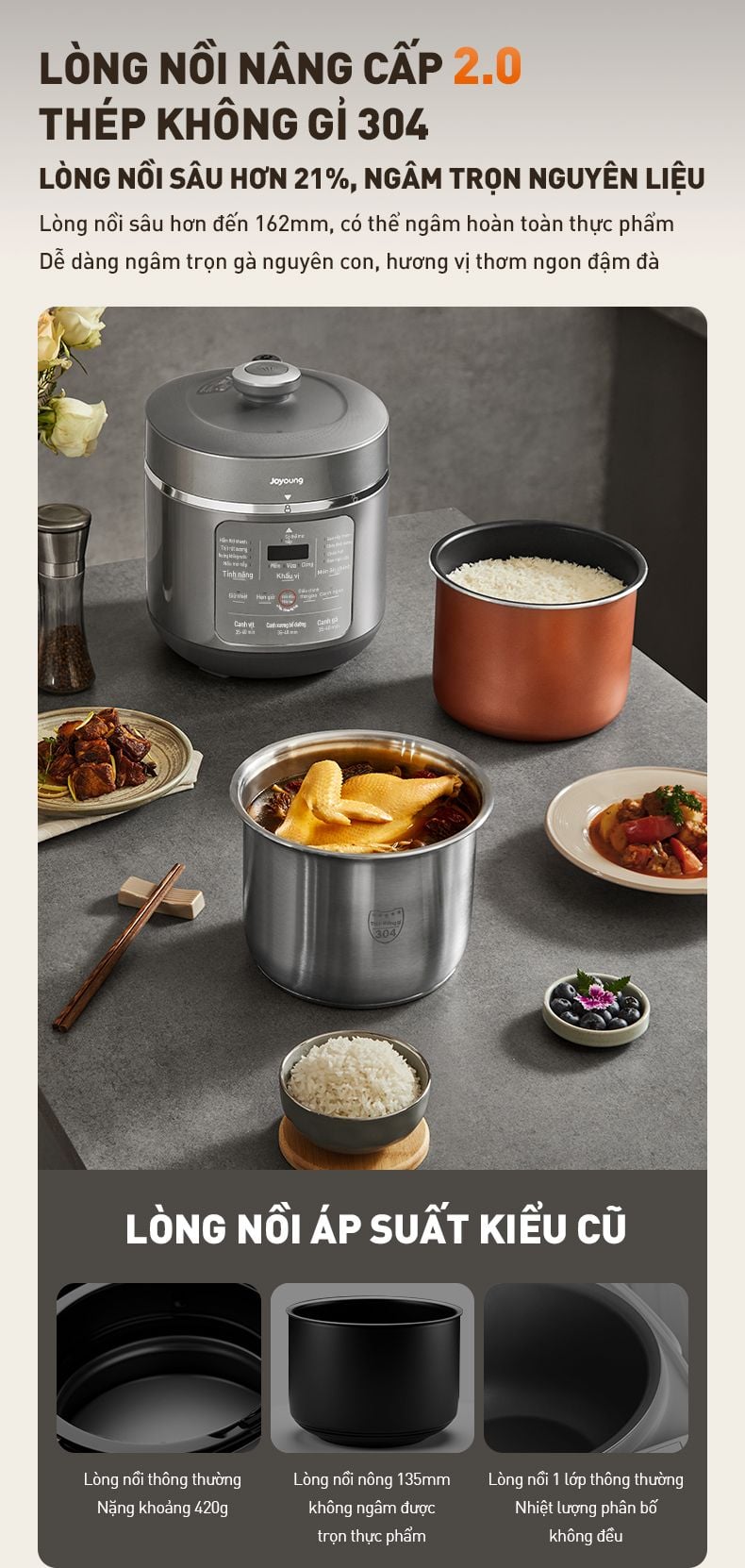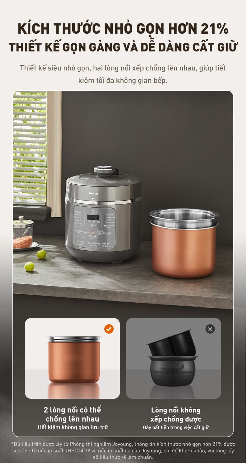Không như những nồi áp suất khác, nồi áp suất Joyoung JHPC chú trọng thiết kế nhỏ gọn giảm 21% diện tích, giúp bạn có được căn bếp ấm cúng nhưng vẫn gọn gàng, ngăn nắp.