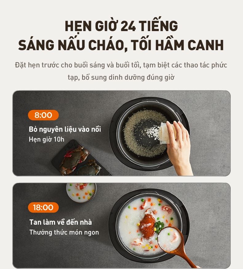Chức năng hẹn giờ 24 tiếng giúp bạn thưởng thức món ăn ngon đúng giờ, có thể cài đặt sẵn khi quay về đã có món ngon chờ bạn thưởng thức.