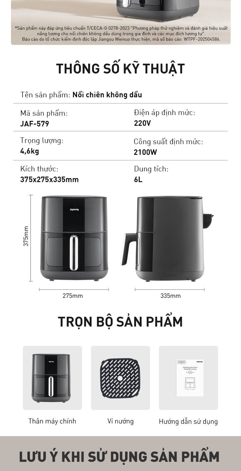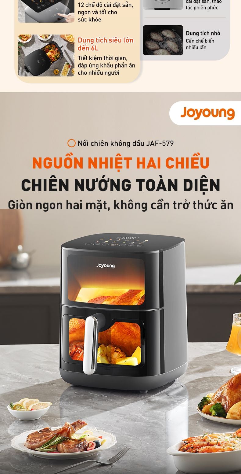 Nồi chiên không dầu JAF-579 được trang bị nguồn nhiệt hai chiều giúp thức ăn chín đều từ trong ra ngoài mà không cần lật trở. Cửa sổ trong suốt còn giúp bạn theo dõi tiến trình món ăn một cách sống động và không lo cháy khét.