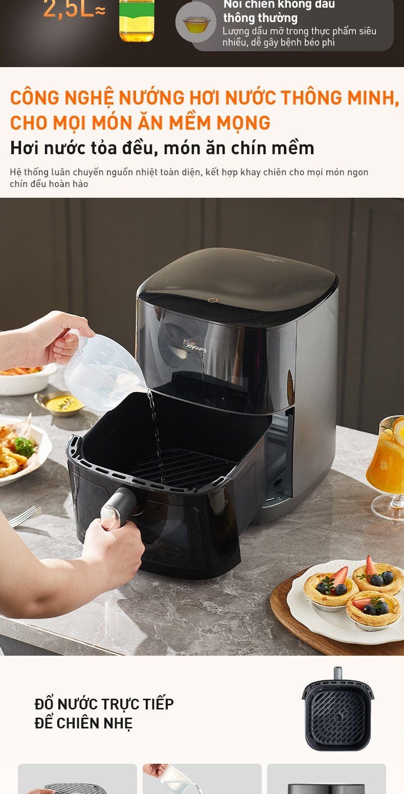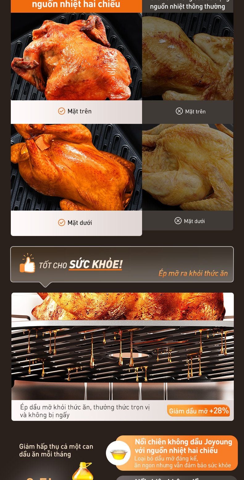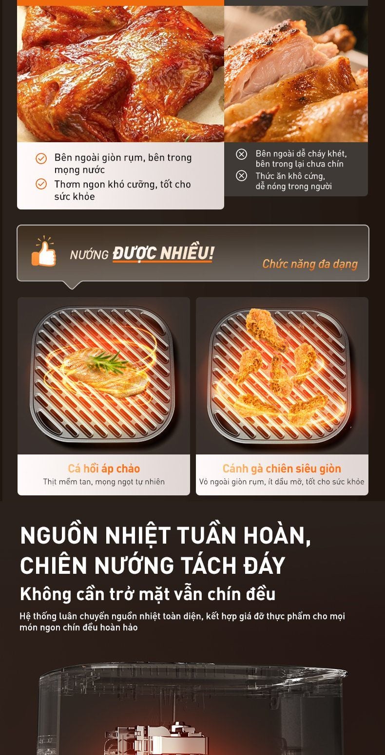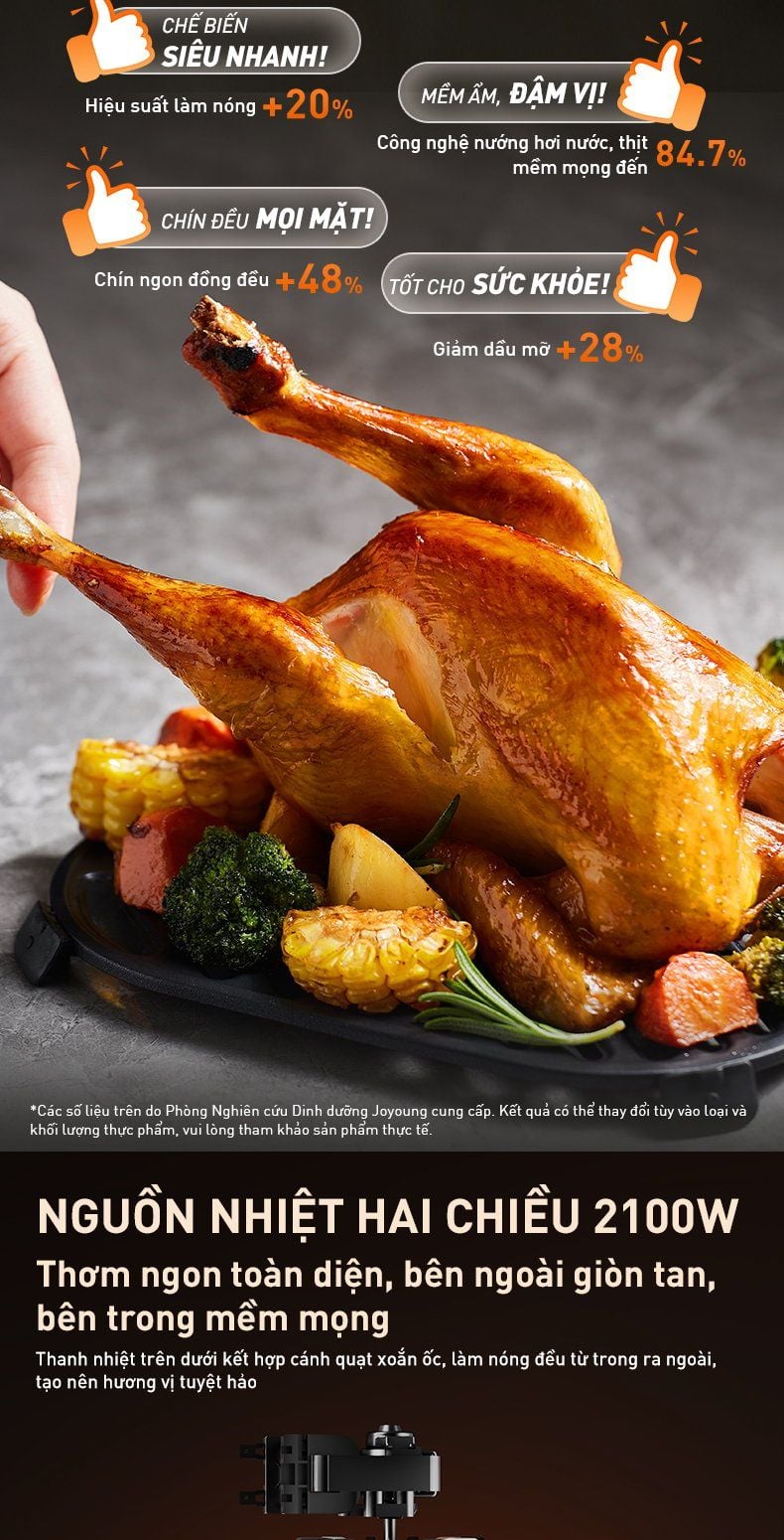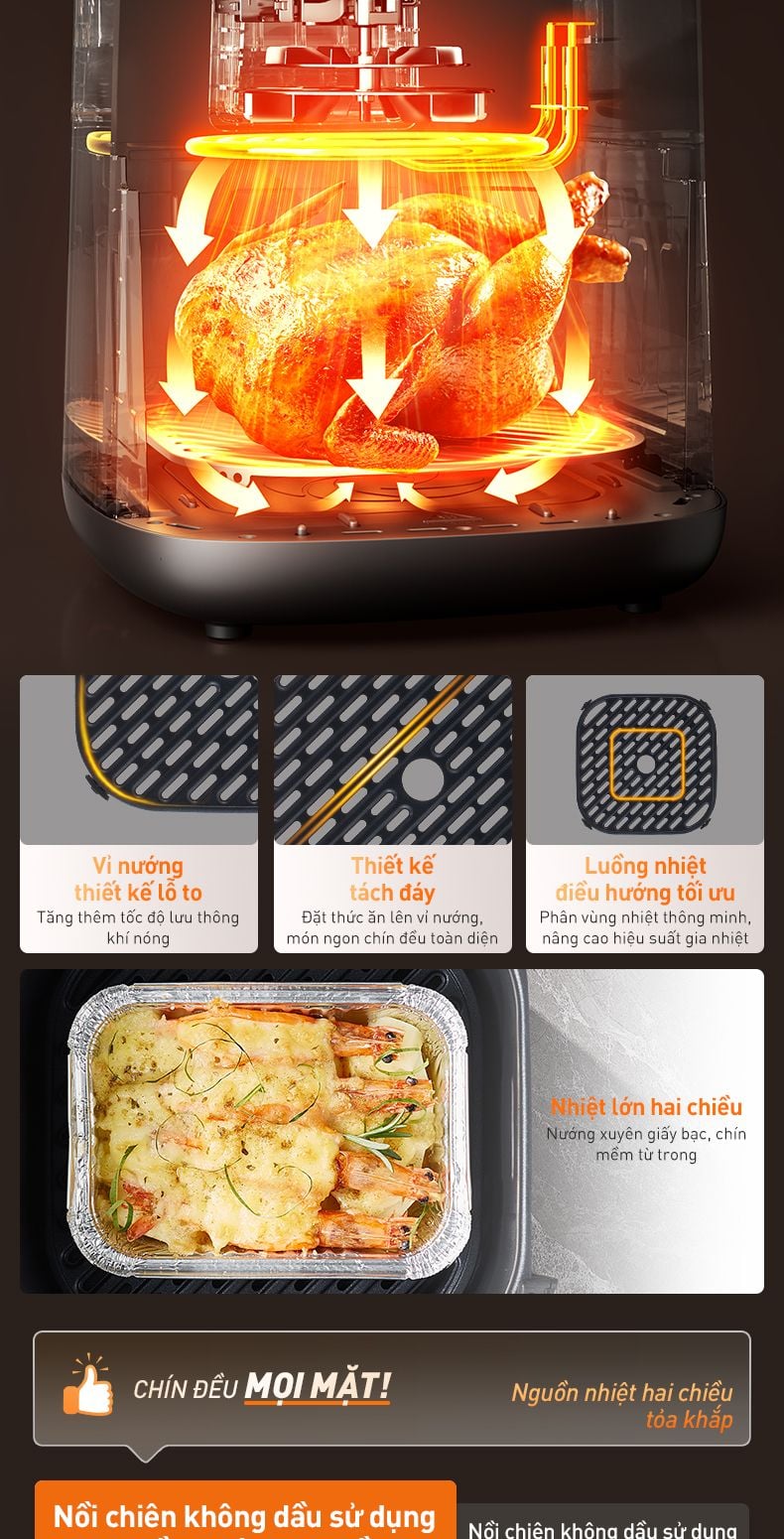 - Nguồn nhiệt hai chiều 2100W: Thanh nhiệt trên dưới kết hợp cánh quạt xoắn ốc, giúp món ăn chín đều từ trong ra ngoài, tạo nên hương vị tuyệt hảo.
