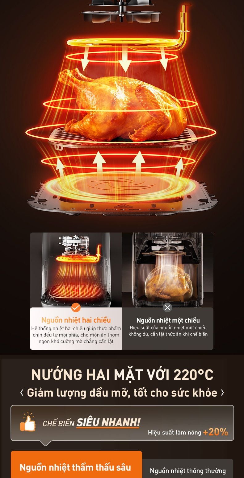 - Nướng hai mặt với 220°C: Hiệu suất làm nóng +20%; Chế biến được nhiều hơn với đa chức năng; Thức ăn chín toàn diện với nguồn nhiệt trên dưới tỏa đều toàn khoang; Ít dầu mỡ hơn, tốt cho sức khỏe.