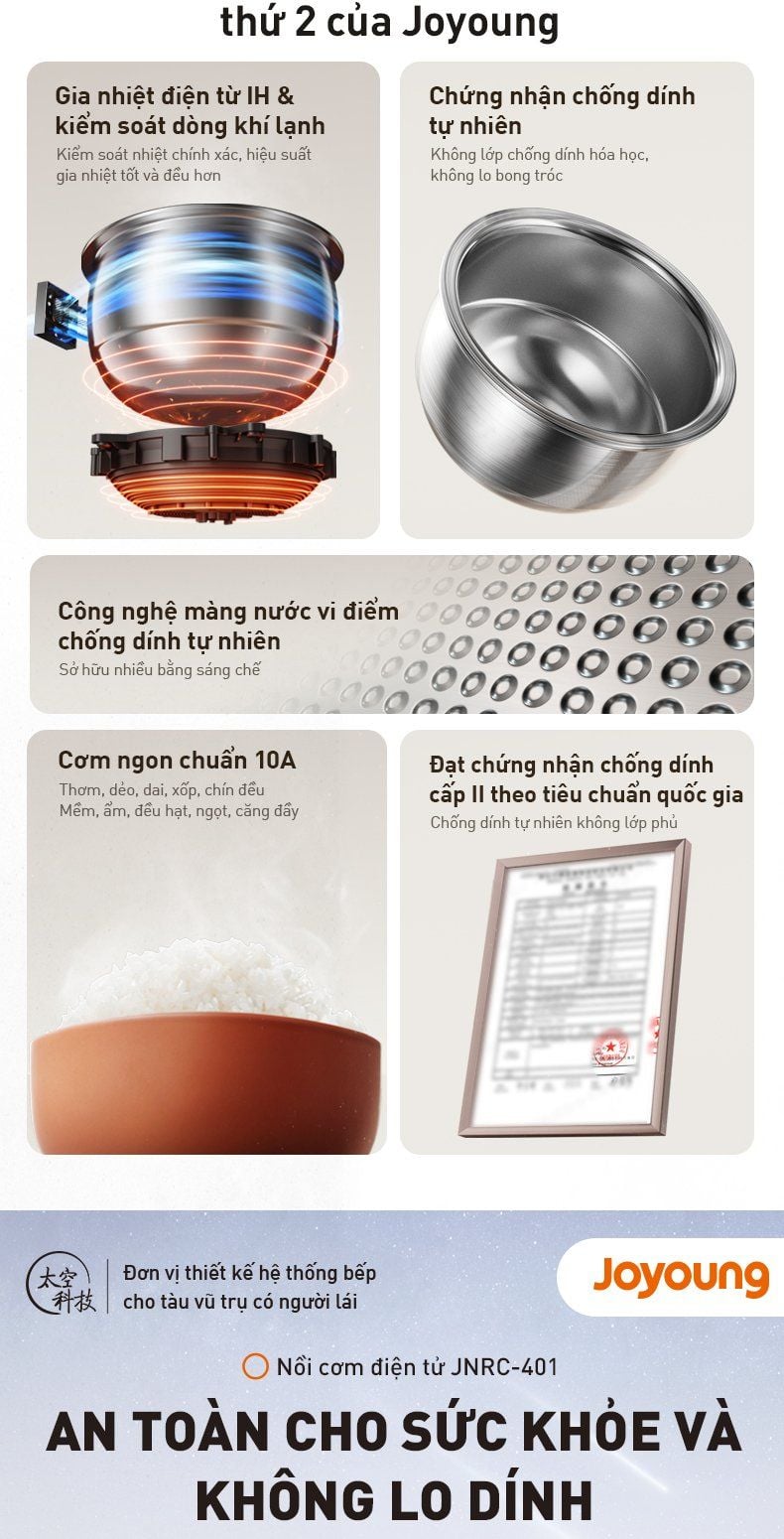 Nồi cơm điện tử JNRC-401 với lòng nồi chống dính tự nhiên không lớp phủ hóa học sẽ giúp bạn an tâm hơn khi dùng bữa và giúp việc vệ sinh trở nên dễ dàng hơn. Ngoài ra, với công nghệ độc đáo của Joyoung, nồi sẽ nấu ra hạt cơm đạt chất lượng chuẩn 10A, tăng thêm hương vị thơm ngon trong từng bữa ăn.