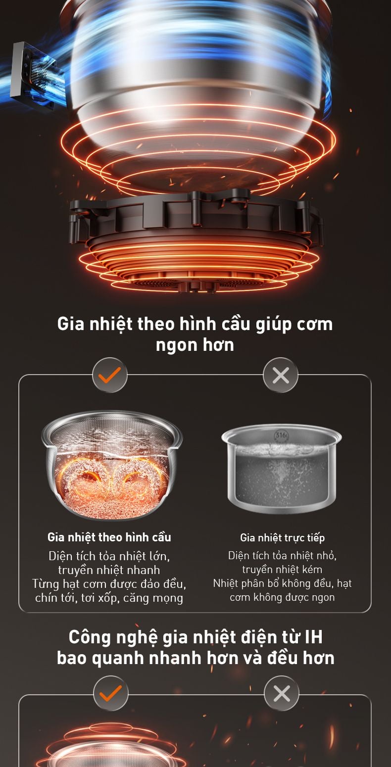 - Gia nhiệt theo hình cầu: Diện tích tỏa nhiệt lớn, truyền nhiệt nhanh, giúp cơm ngon hơn.