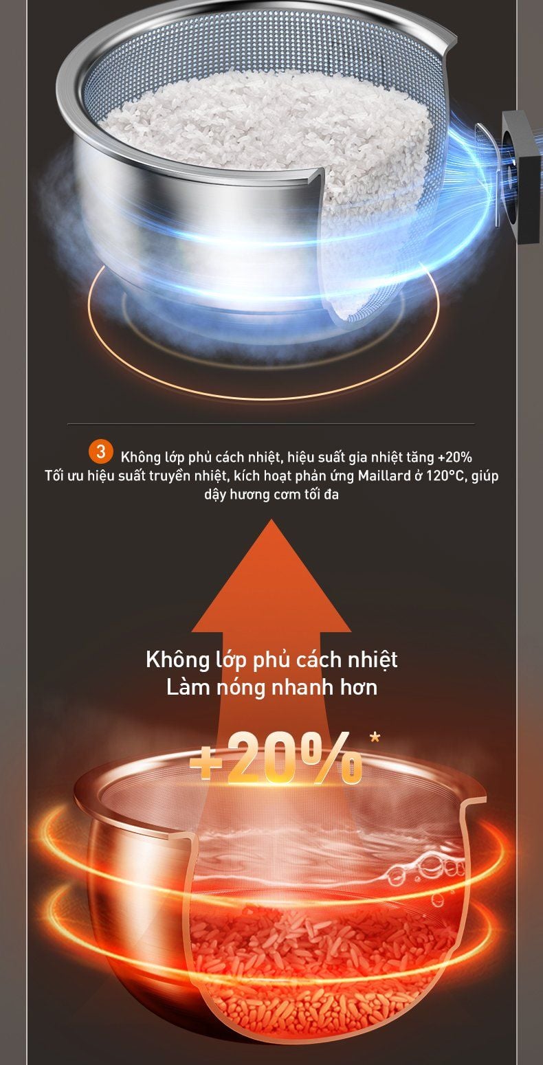 - Tối ưu hiệu suất truyền nhiệt, kích hoạt phản ứng Maillard ở 120°C, giúp dậy hương cơm tối đa.