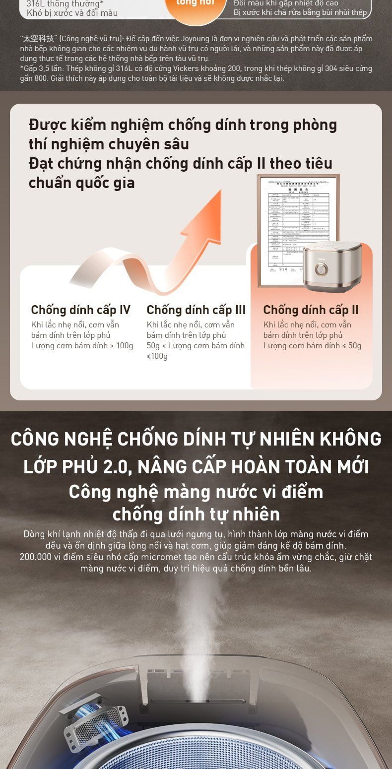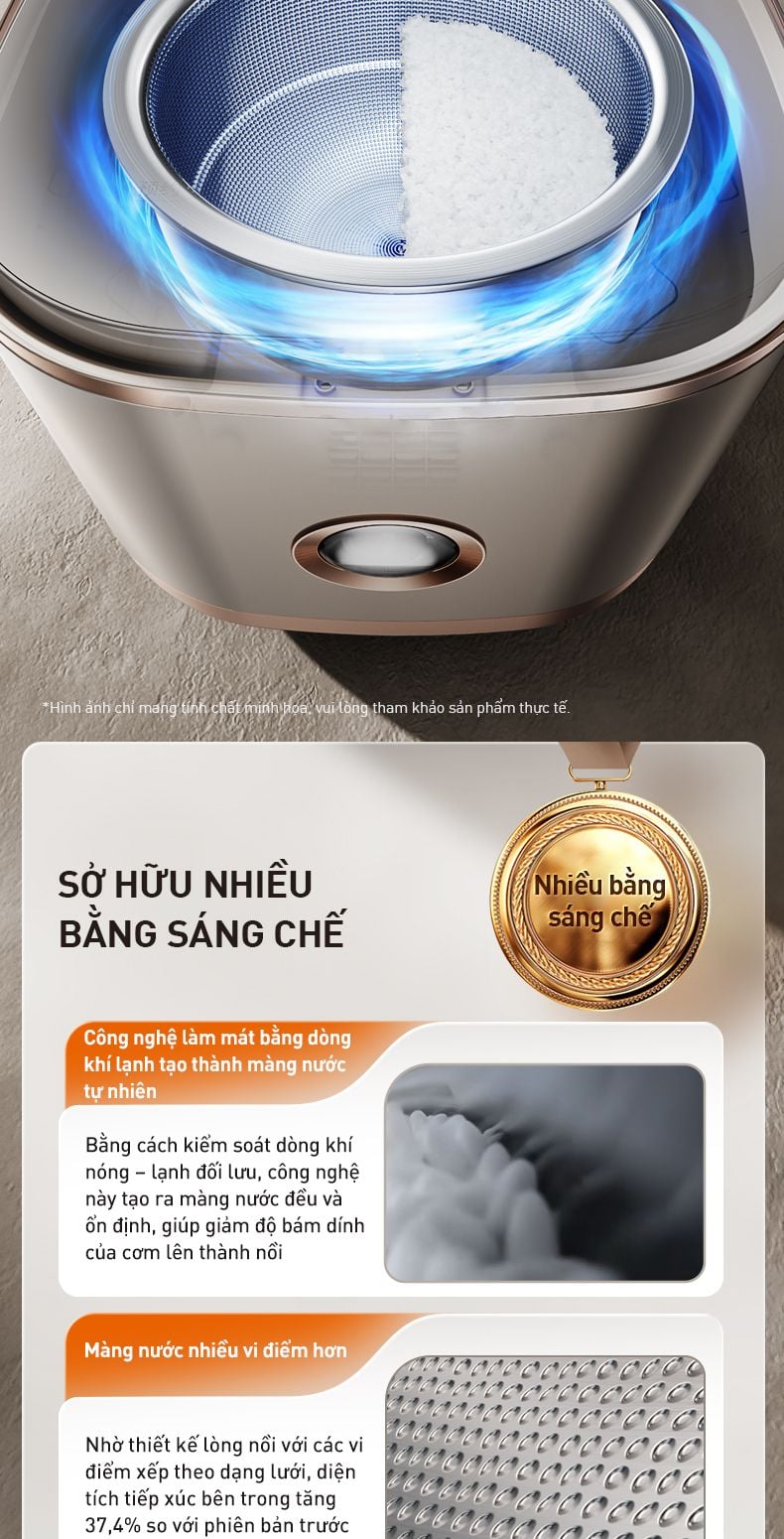 - Công nghệ màng nước vi điểm chống dính tự nhiên: Màng nước gồm 200.000 vi điểm siêu nhỏ cấp micromet giữa lòng nồi và hạt cơm, giúp khóa ẩm và chống dính bền lâu.