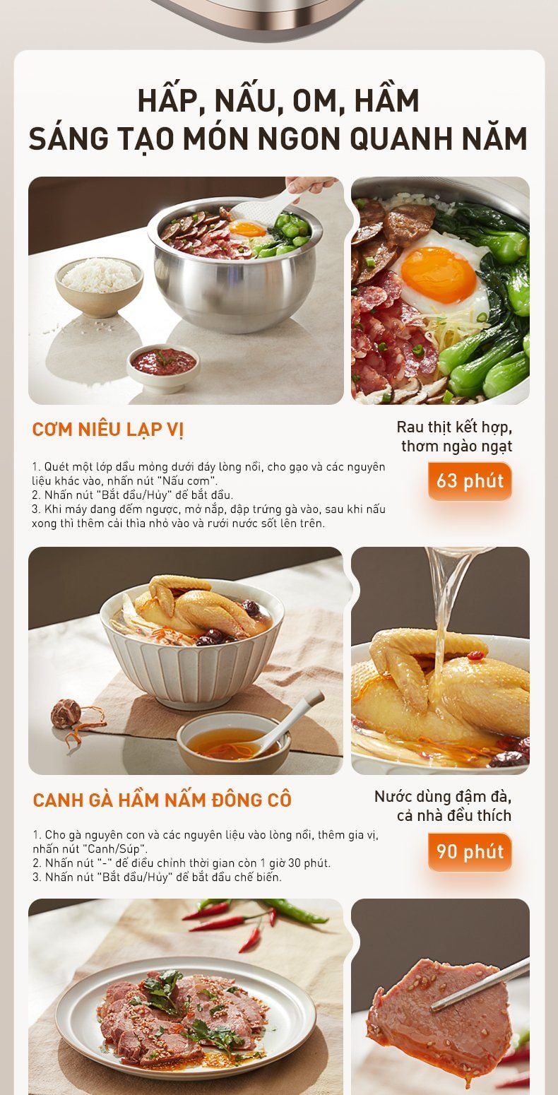 - Hấp, nấu, hầm, om đều có thể chế biến: Cơm niêu lạp vị, canh gà hầm nấm đông cô, bò om vị truyền thống...